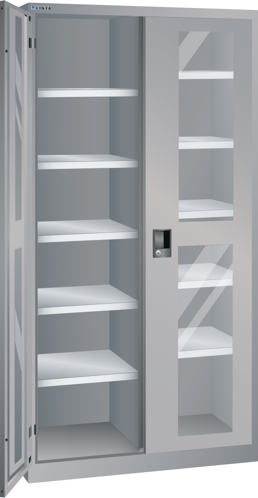 Flügeltürschränke: Die Schränke sind je nach Modell ausgestattet mit: Verstellböden verzinkt, 30 mm stark, Tragkraft 60 kg. Auszugböden und Schubladen lackiert, Anthrazitgrau, RAL 7016, Tragkraft 50 kg