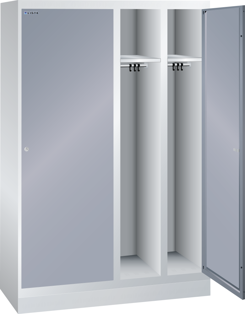Garderobenschränke: Die Garderobenschränke sind je Abteil und je nach Modell ausgestattet mit: 1-flügeliger Vollblech-Tür einschlagend, Oberfläche glatt oder mit Lochfeld zur zusätzlichen Belüftung (2 Abteile verschliessend / 1 Schloss für 2 Abteile), 1 Hutboden, 1 Kleiderstange mit je 3 verschiebbaren Kleiderhaken, 1 Handtuchhalter