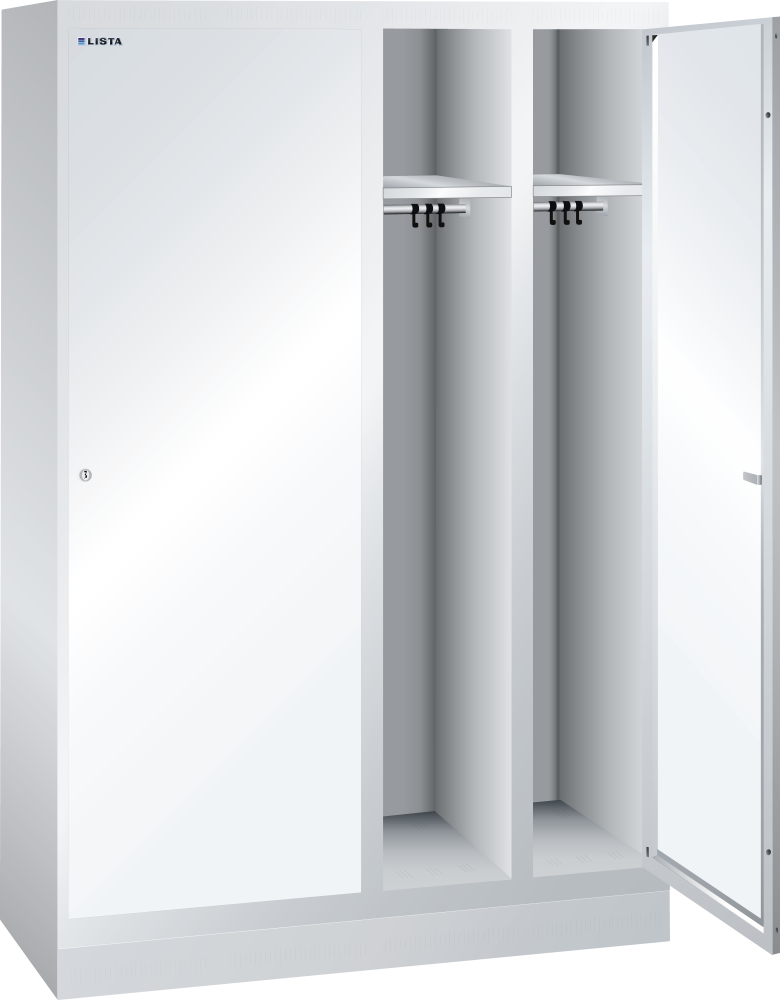 Garderobenschränke: Die Garderobenschränke sind je Abteil und je nach Modell ausgestattet mit: 1-flügeliger Vollblech-Tür einschlagend, Oberfläche glatt oder mit Lochfeld zur zusätzlichen Belüftung (2 Abteile verschliessend / 1 Schloss für 2 Abteile), 1 Hutboden, 1 Kleiderstange mit je 3 verschiebbaren Kleiderhaken, 1 Handtuchhalter