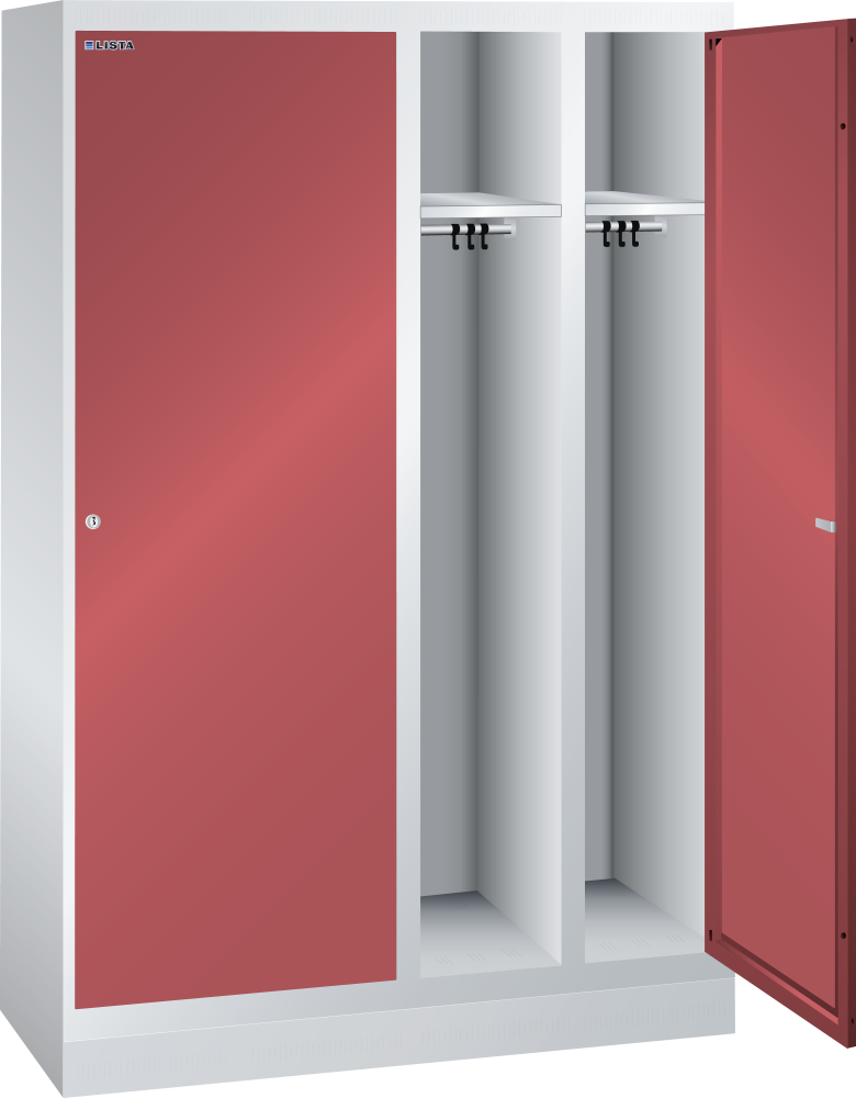 Garderobenschrank (BxTxH) 1200x500x1800mm 4 Abteile mit Sockel, Türen glatt, Sicherheits-Drehknopfverschluss Lichtgrau RAL 7035 / Rubinrot RAL 3003