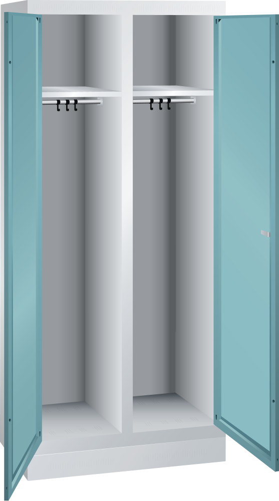 Garderobenschränke: Die Garderobenschränke sind je Abteil und je nach Modell ausgestattet mit: 2-flügeliger Vollblech-Tür einschlagend, Oberfläche glatt oder mit Lochfeld zur zusätzlichen Belüftung (2 Abteile verschliessend / 1 Schloss für 2 Abteile), 1 Hutboden, 1 Kleiderstange mit je 3 verschiebbaren Kleiderhaken, 1 Handtuchhalter