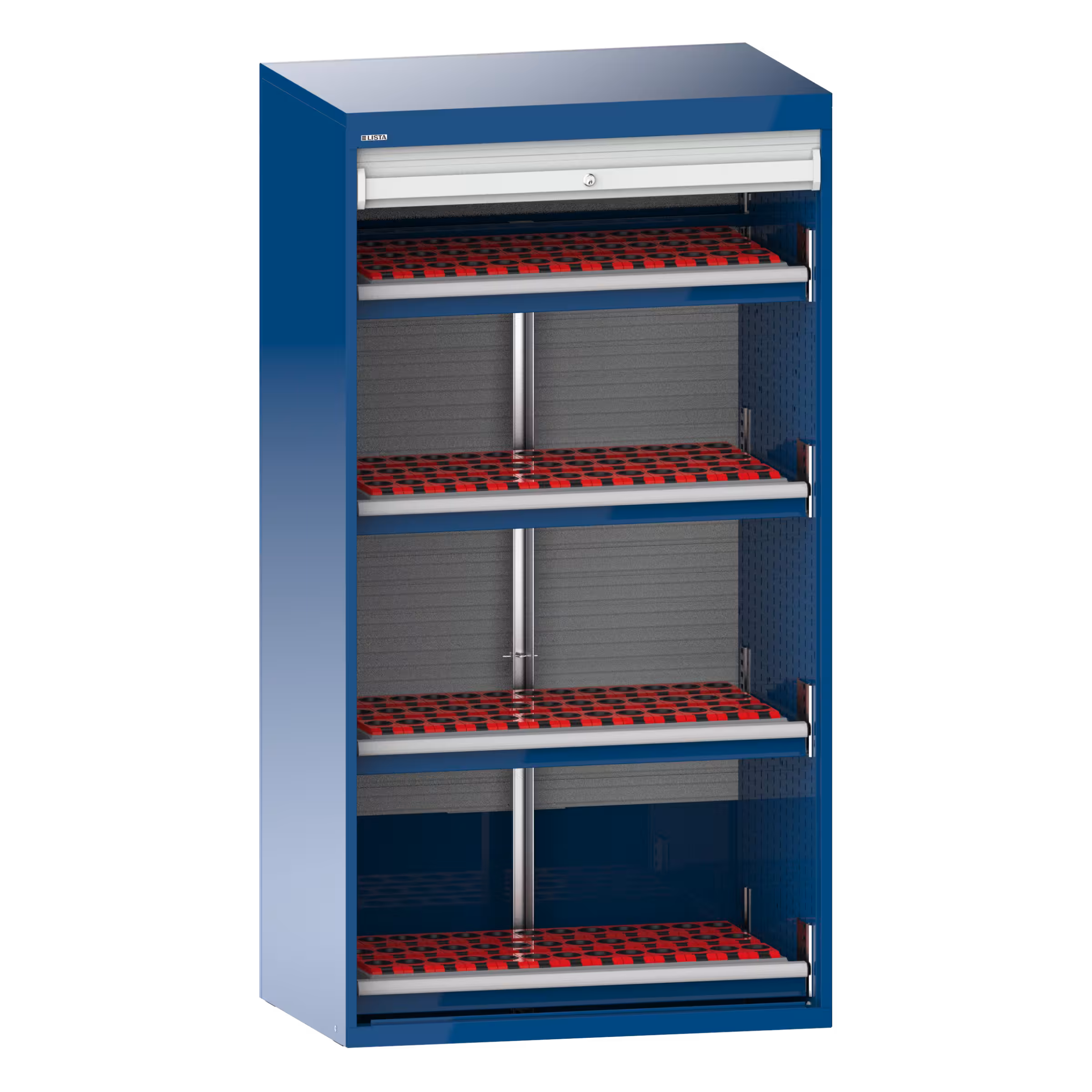 Schrankgehäuse: Die Gehäuse sind mit doppelwandigen, innen geschlitzten Seitenwänden zum Einhängen von Auszug- und Verstellböden, Schubladen und Werkzeugwechselrahmen ausgestattet. Der Verstellbereich ist im 25 mm-Raster unterteilt. Ausführung: Stahlblech.