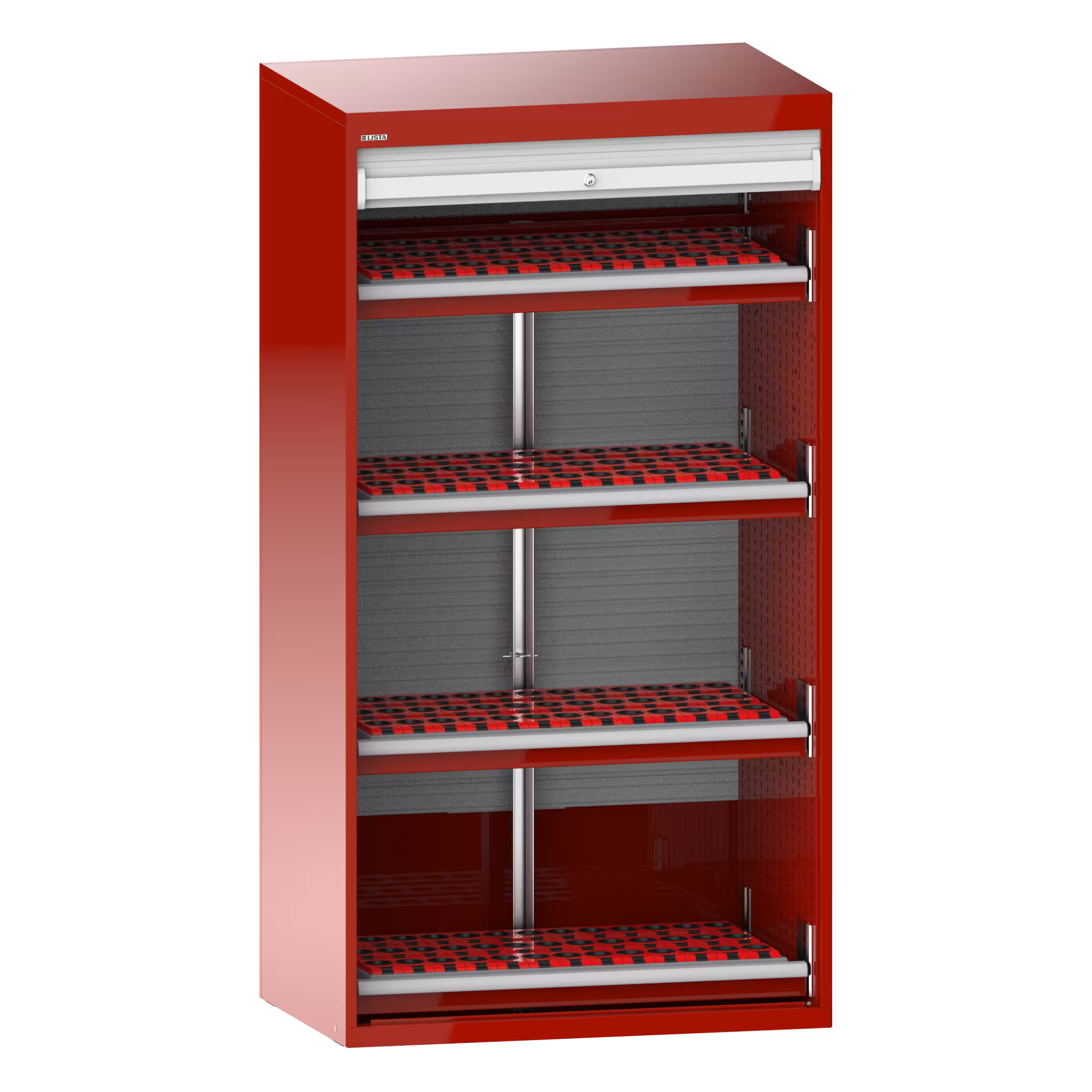 NC-Schrank mit Rollladen 54x27E (BxTxH) 1038x691x1950mm 4 Schubladen, 156 Halter ISO-SK 40 KEY Lock Rubinrot RAL 3003