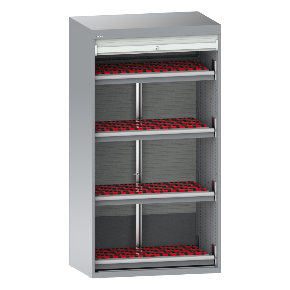 Schrankgehäuse: Die Gehäuse sind mit doppelwandigen, innen geschlitzten Seitenwänden zum Einhängen von Auszug- und Verstellböden, Schubladen und Werkzeugwechselrahmen ausgestattet. Der Verstellbereich ist im 25 mm-Raster unterteilt. Ausführung: Stahlblech.