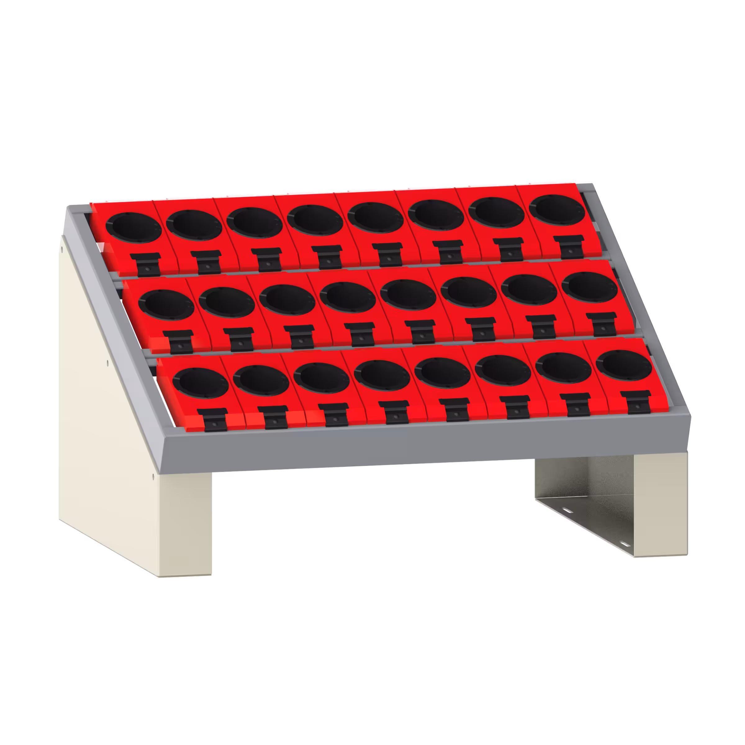 NC-Tischständer: Es sind vorkonfigurierte Modelle oder individuelle Konfigurationen mit eingeschraubten Einsatzrahmen oder schraubenlosem Einhängen der Werkzeugwechselrahmen verfügbar. Es ist eine horizontale oder geneigte Positionierung der Werkzeugwechselrahmen möglich. Ausführung: Stahlblech