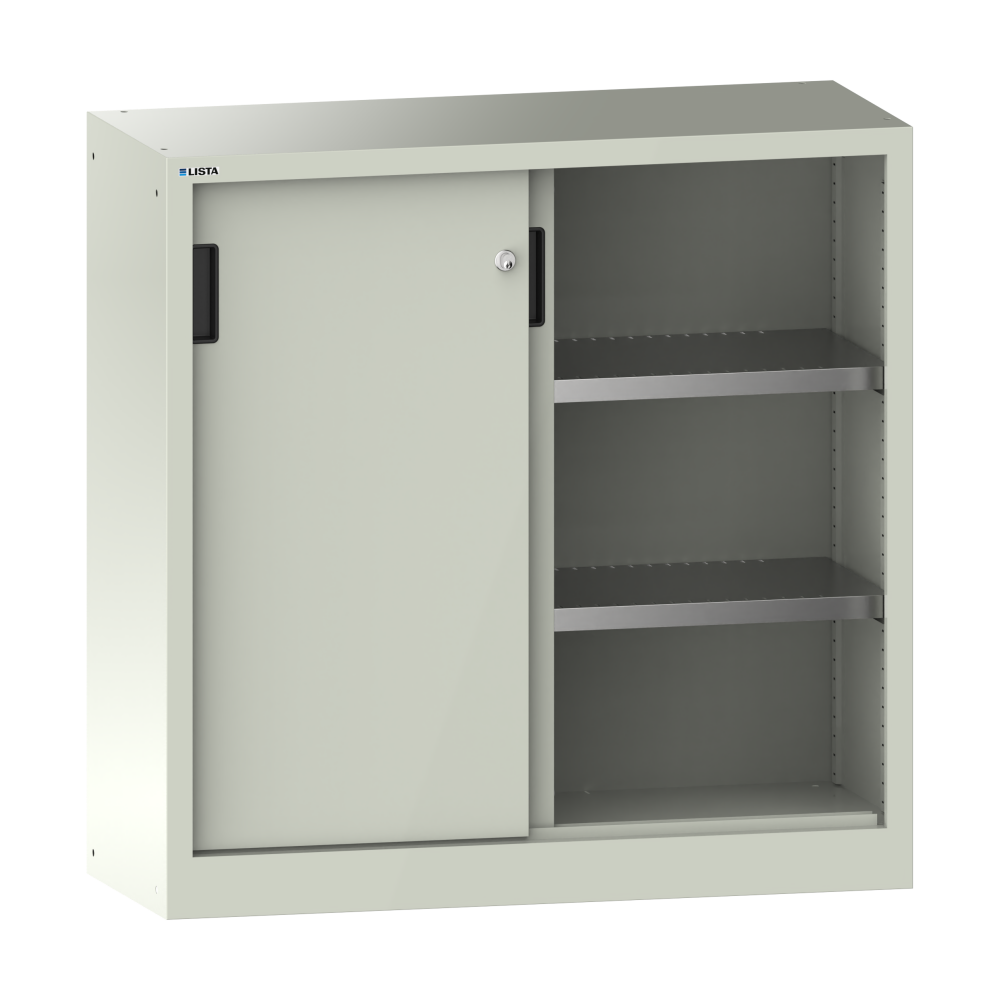Schiebetürschrank mit 2 Vollblech-Türen (BxTxH) 1000x400x1000mm 2 Verstellböden KEY Lock Grauweiss RAL 9002
