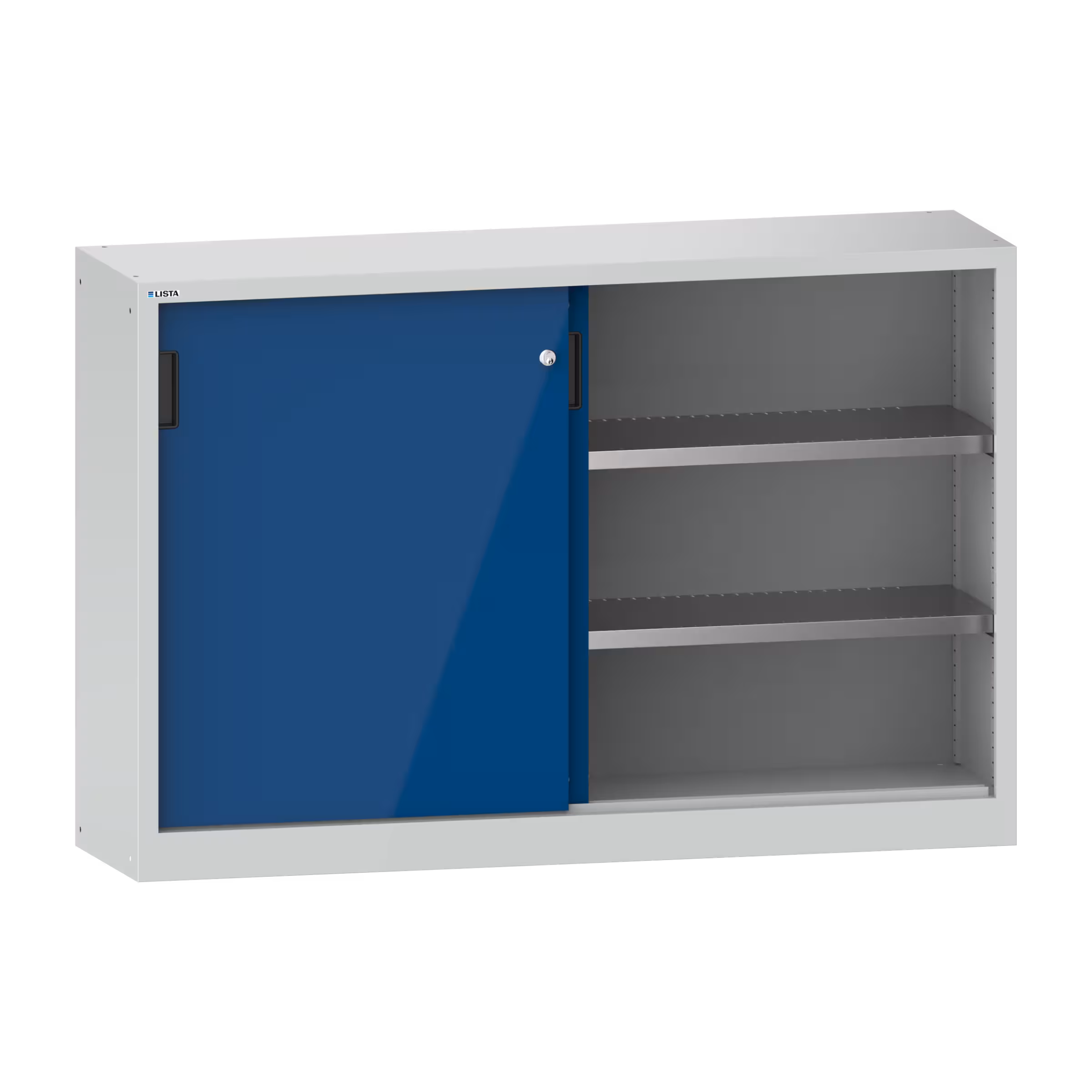 Schiebetürschrank mit 2 Vollblech-Türen und Trennwand (BxTxH) 1500x400x1000mm 4 Verstellböden KEY Lock Lichtgrau RAL 7035 / Signalblau RAL 5005