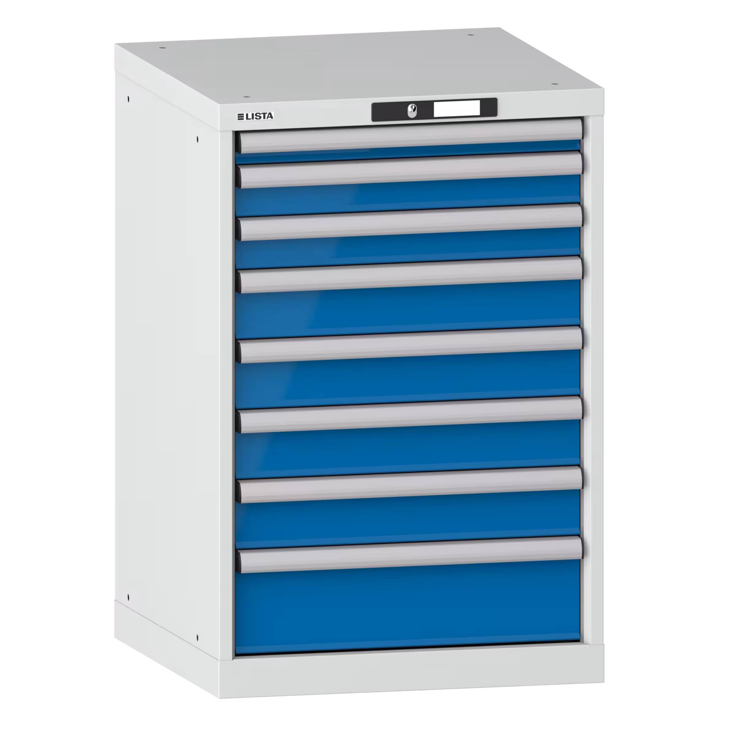 Schubladenschrank 27x27E (BxTxH) 564x572x850mm 8 Schubladen (1x50/2x75/4x100/1x150) 75kg KEY Lock Lichtgrau RAL 7035 / Lichtblau RAL 5012