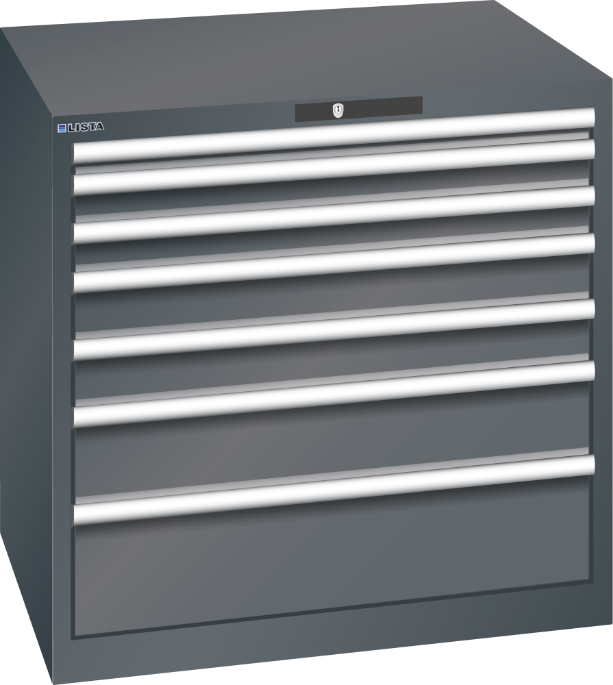 Schubladenschrank 45x36E (BxTxH) 870x725x850mm 7 Schubladen (1x50*/2x75/2x100/1x150/1x200) *75/200kg AUTO Lock Schiefergrau RAL 7015