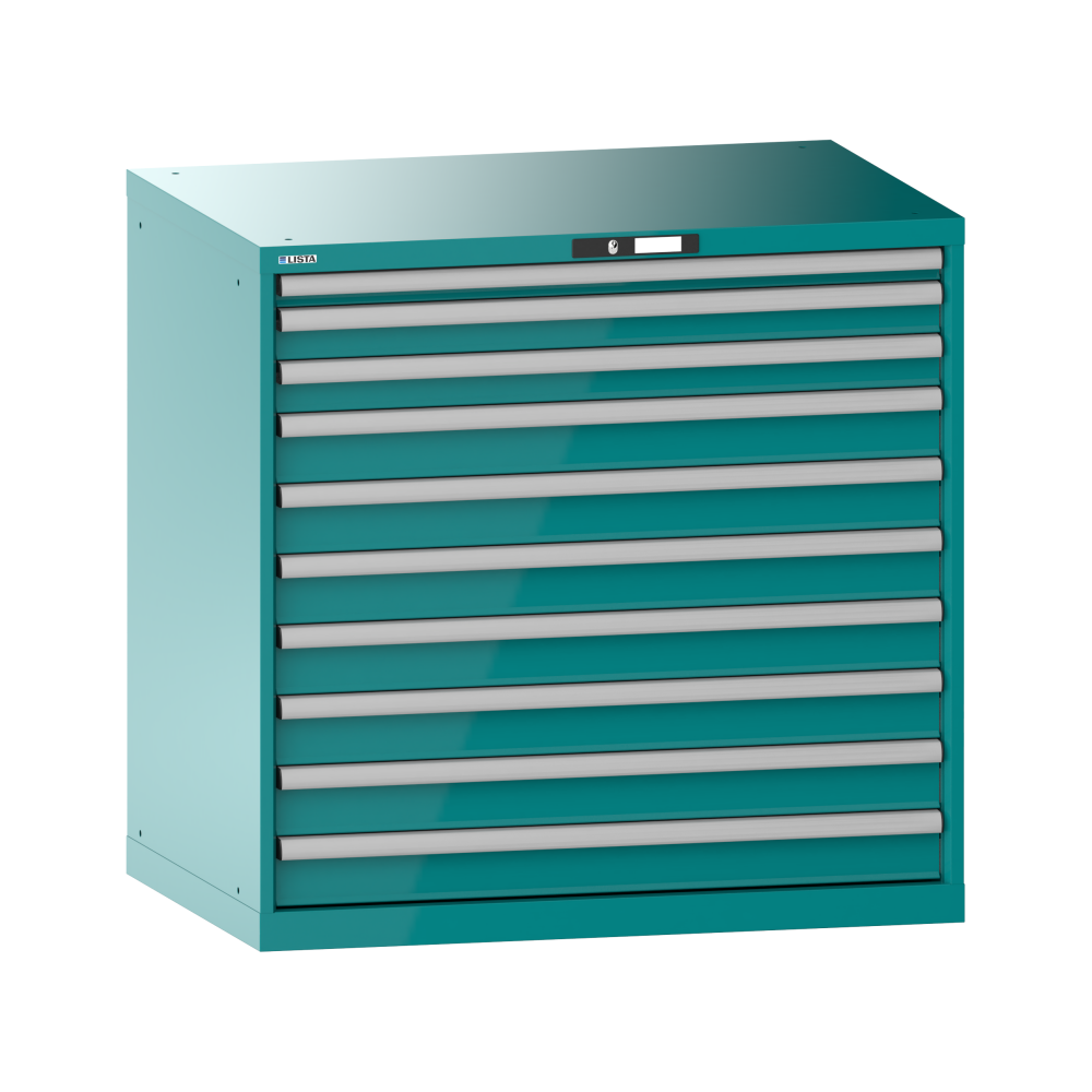 Schubladenschrank 54x36E (BxTxH) 1023x725x1000mm 10 Schubladen (1x50*/2x75/7x100) *75/200kg KEY Lock Türkisblau RAL 5018