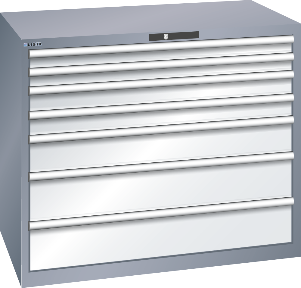 Schubladenschrank 64x36E (BxTxH) 1193x725x1000mm 7 Schubladen (2x75/2x100/1x150**/2x200**) 75/**200kg CODE Lock Grau metallic NCS S 6502-B / Lichtgrau RAL 7035