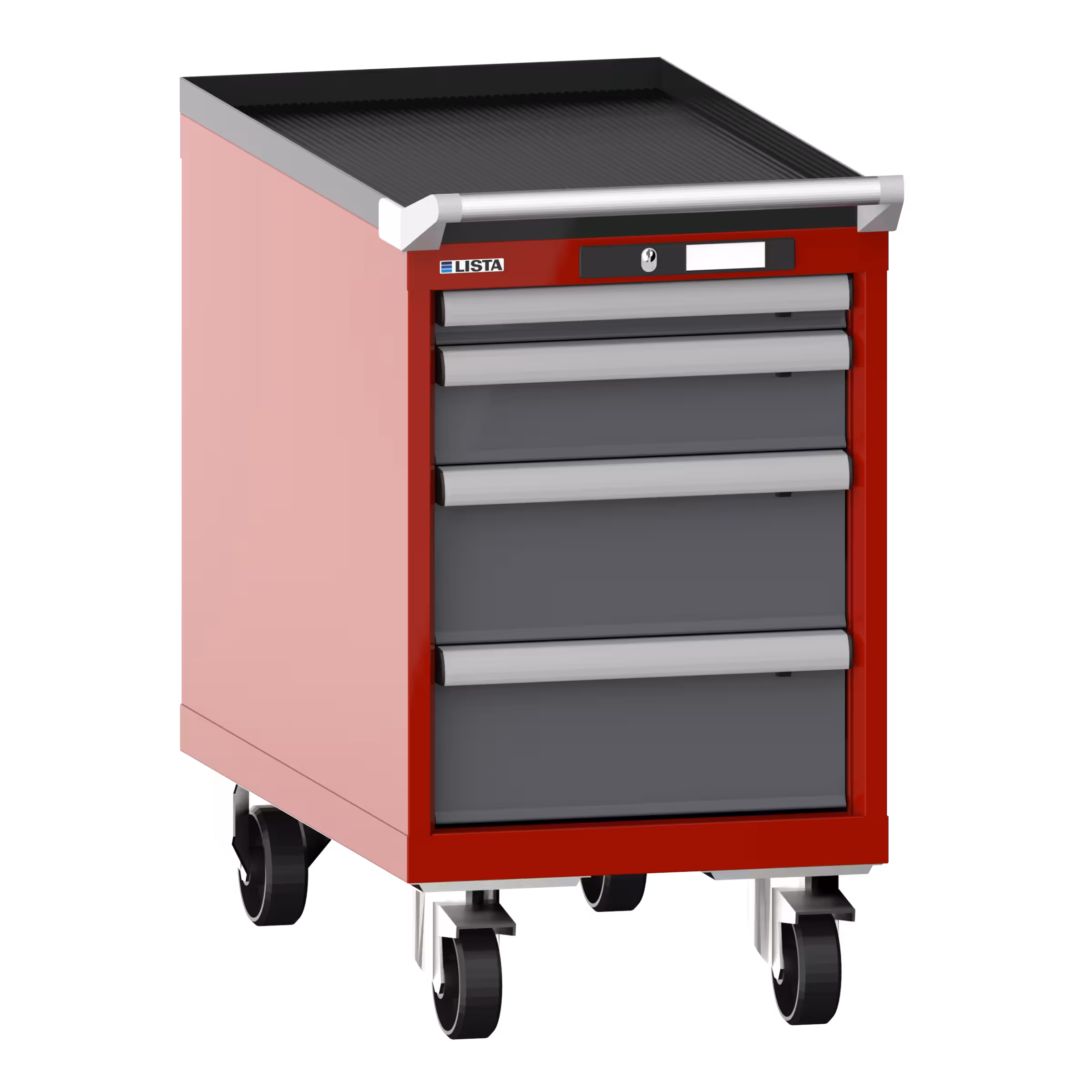 Schubladenschrank mobil 18x36E (BxTxH) 411x725x723mm 4 Schubladen (1x50/1x100/2x150) 75kg Nylonrollen Ø100mm AUTO Lock Rubinrot RAL 3003 / Grau metallic NCS S 6502-B