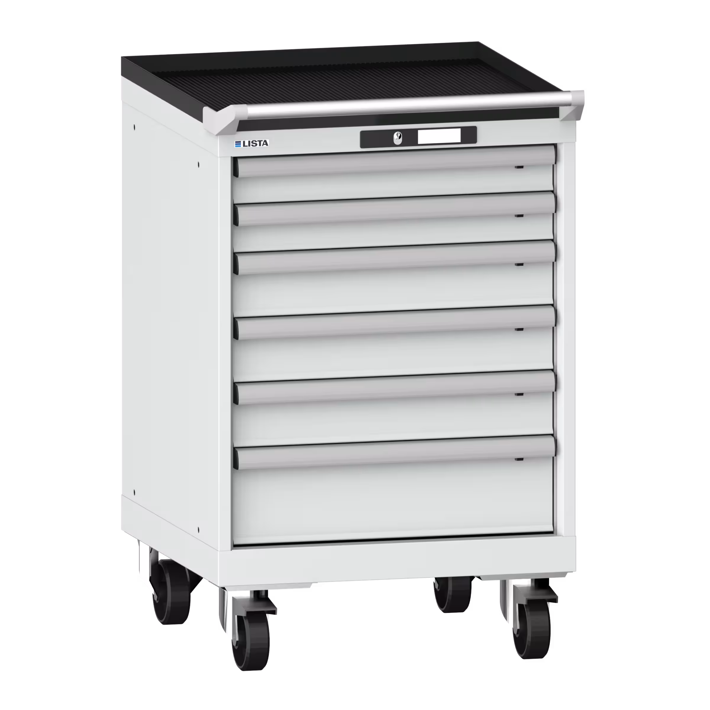 Schubladenschrank mobil 27x27E (BxTxH) 564x572x890mm 6 Schubladen (2x75/3x100/1x150) 75kg Nylonrollen Ø100mm CODE Lock Hellgrau NCS S 2000-N