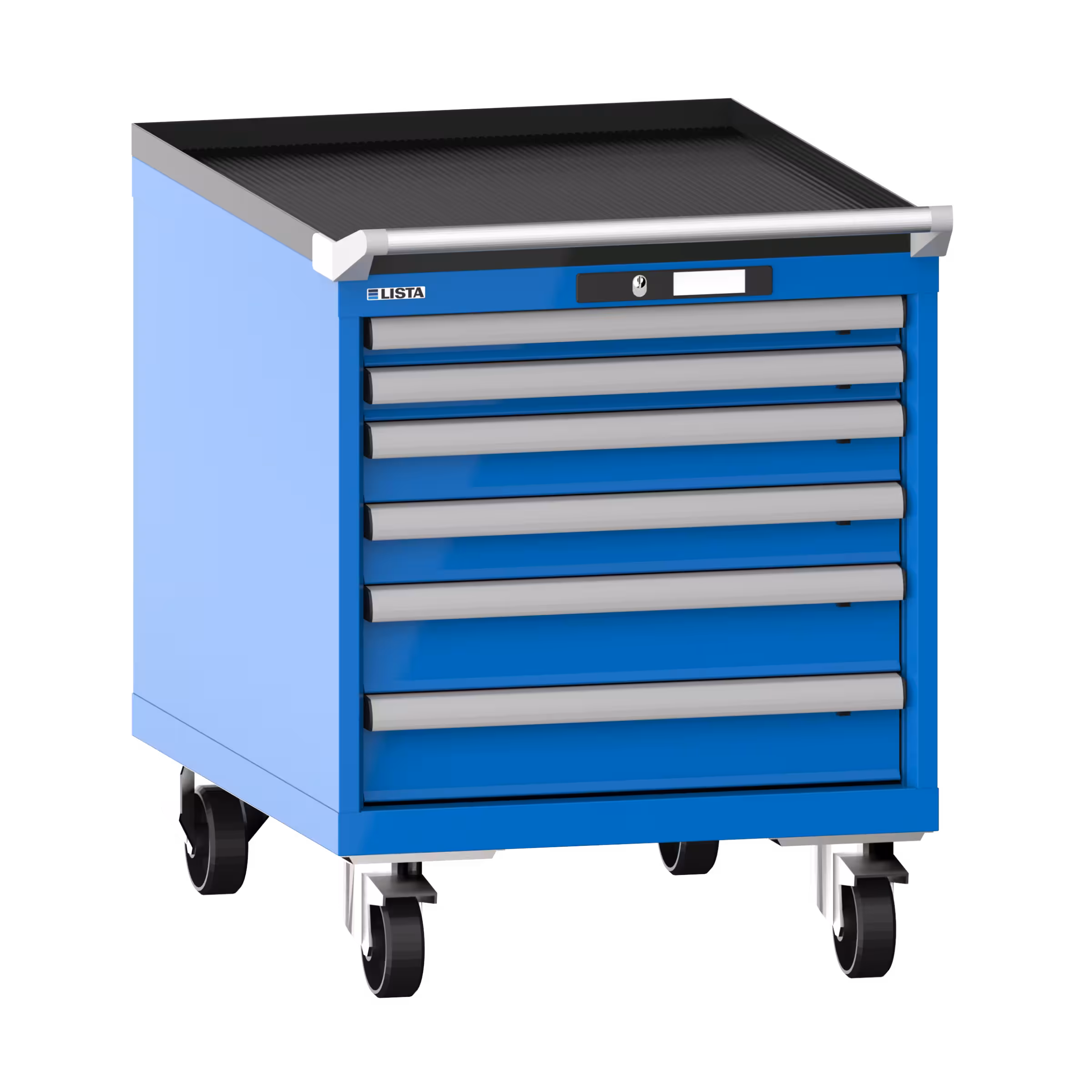 Schubladenschrank mobil 27x36E (BxTxH) 564x725x723mm 6 Schubladen (2x50/2x75/2x100) 75kg Nylonrollen Ø100mm KEY Lock Himmelblau RAL 5015