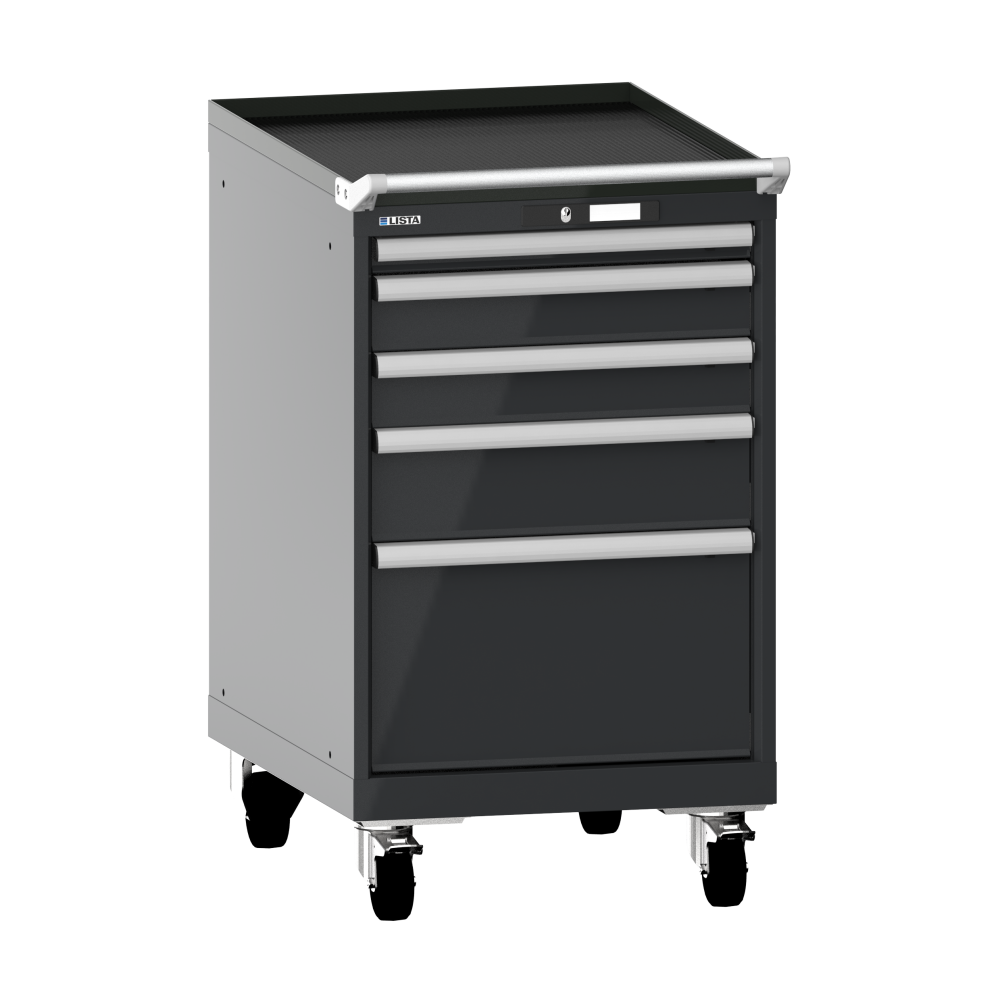 Schubladenschrank mobil 27x36E (BxTxH) 564x725x990mm 5 Schubladen (1x50/2x100/1x150/1x300) 75kg Nylonrollen Ø100mm KEY Lock Anthrazitgrau RAL 7016
