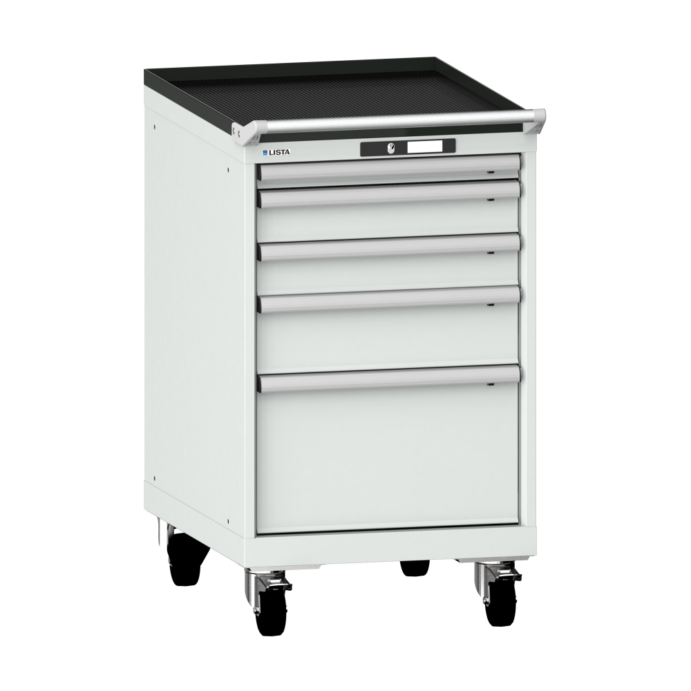 Schubladenschrank mobil 27x36E (BxTxH) 564x725x990mm 5 Schubladen (1x50/2x100/1x150/1x300) 75kg Nylonrollen Ø100mm KEY Lock Hellgrau NCS S 2000-N