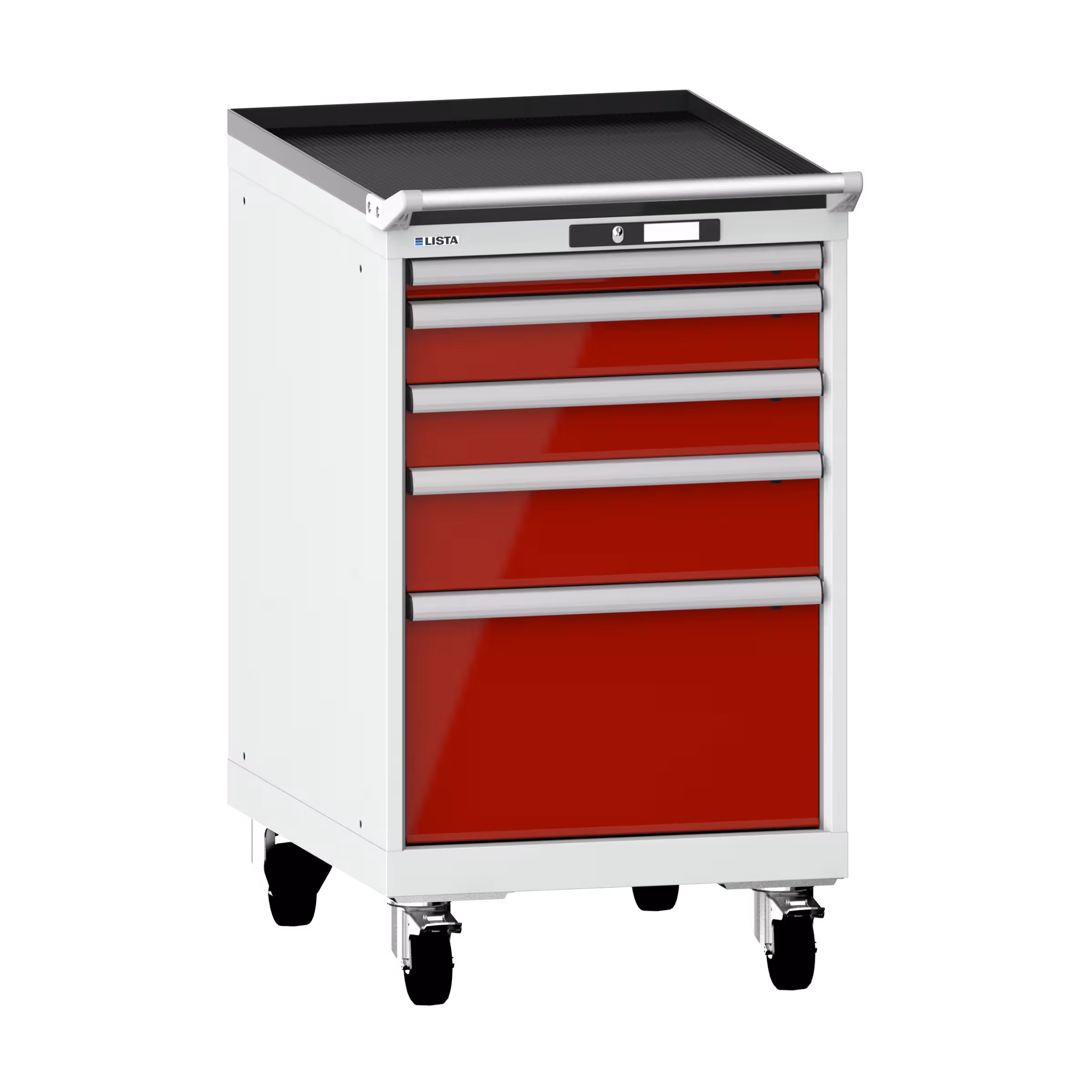 Schubladenschrank mobil 27x36E (BxTxH) 564x725x990mm 5 Schubladen (1x50/2x100/1x150/1x300) 75kg Nylonrollen Ø100mm KEY Lock Lichtgrau RAL 7035 / Rubinrot RAL 3003