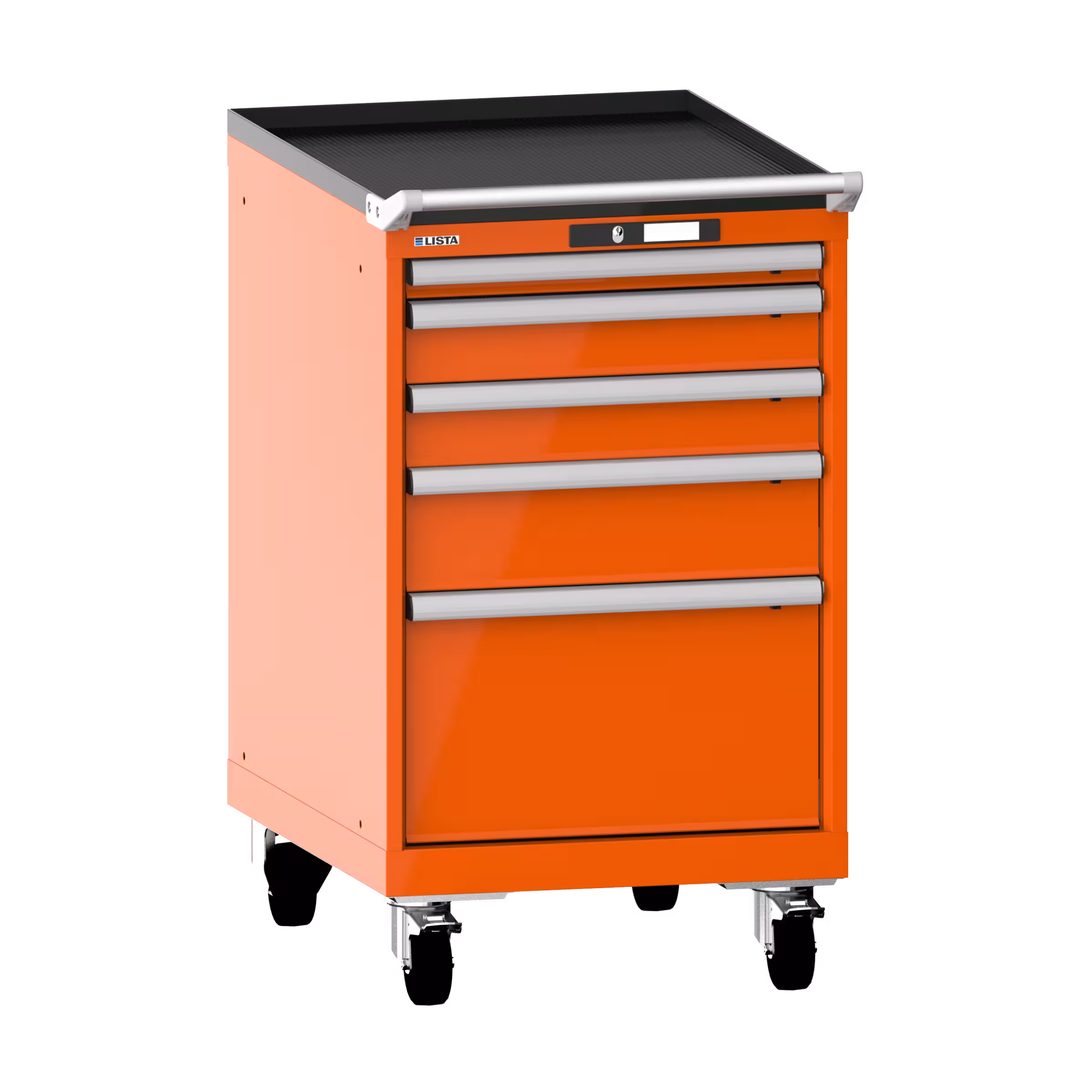 Schubladenschrank mobil 27x36E (BxTxH) 564x725x990mm 5 Schubladen (1x50/2x100/1x150/1x300) 75kg Nylonrollen Ø100mm KEY Lock Orange RAL 2004