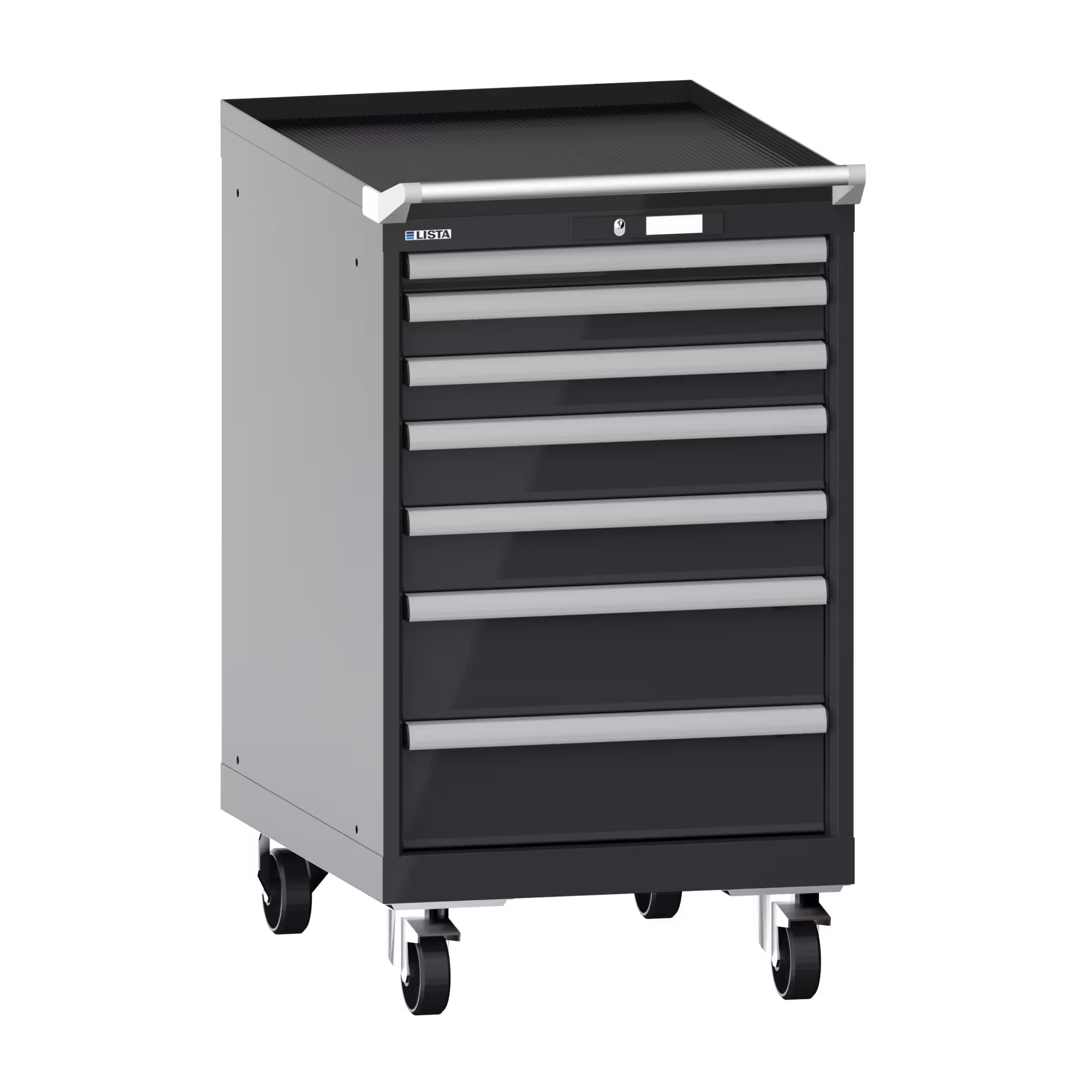 Schubladenschrank mobil 27x36E (BxTxH) 564x725x990mm 7 Schubladen (1x50/2x75/2x100/2x150) 75kg Nylonrollen Ø100mm RFID Lock Anthrazitgrau RAL 7016