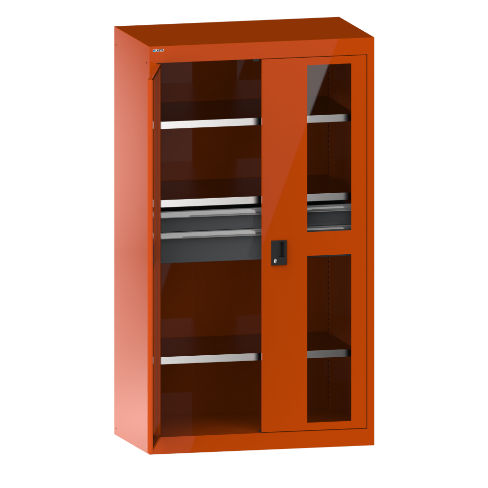 Schwerlastschrank mit 2 Sichtfenster-Flügeltüren 54x27E (BxTxH) 1100x641x1950mm 3 Verstellböden, 2 Schubladen KEY Lock Orange RAL 2004