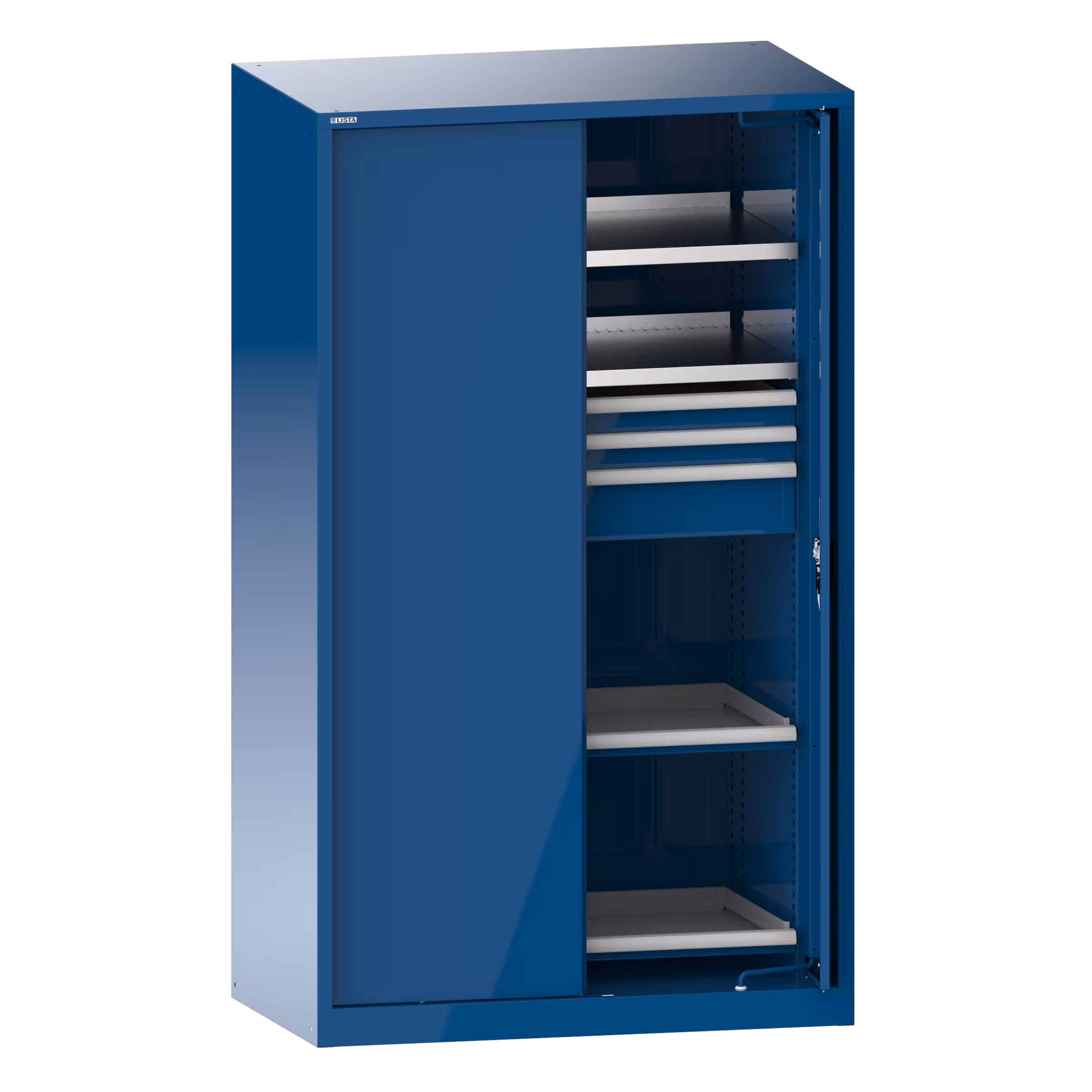 Schwerlastschrank mit 2 Vollblech-Einschwenktüren 54x27E (BxTxH) 1146x690x1950mm 2 Verstellböden, 3 Schubladen, 2 Auszugböden KEY Lock Enzianblau RAL 5010