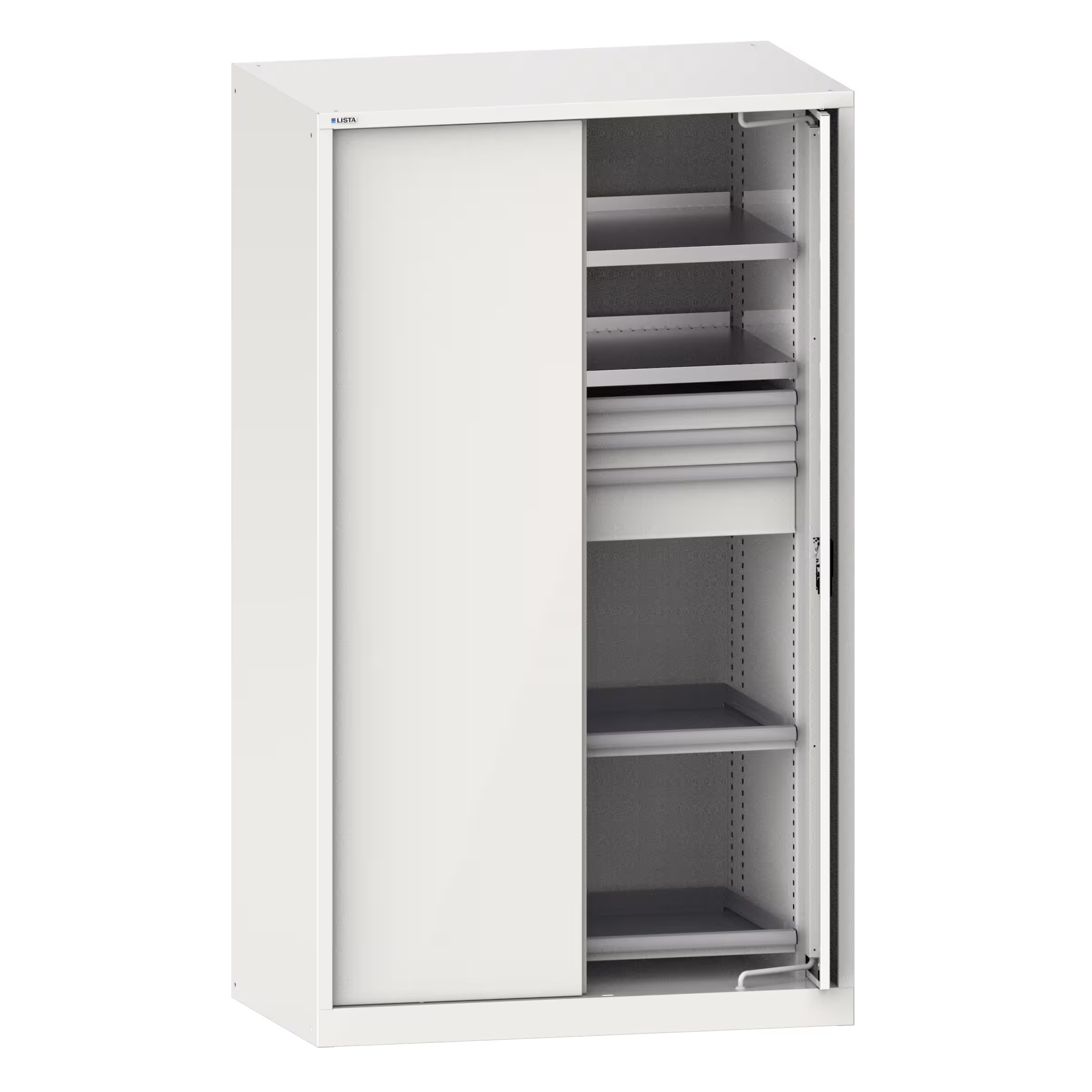 Schwerlastschrank mit 2 Vollblech-Einschwenktüren 54x27E (BxTxH) 1146x690x1950mm 2 Verstellböden, 3 Schubladen, 2 Auszugböden KEY Lock Reinweiss RAL 9010