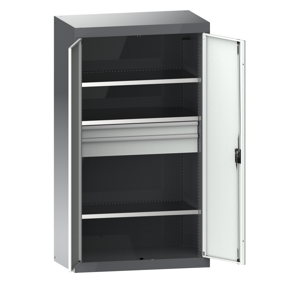 Schwerlastschränke mit Flügeltüren: Die Schränke sind ausgestattet mit: Verstellböden verzinkt, 35 mm stark, Auszugböden und Schubladen lackiert generell Grau, NCS 4502-B. Flügeltüren aus einem Stück gekantet, wahlweise aus Vollblech oder mit Sichtfenstern. Schliessungen KEY Lock, CODE Lock oder RFID Lock möglich.