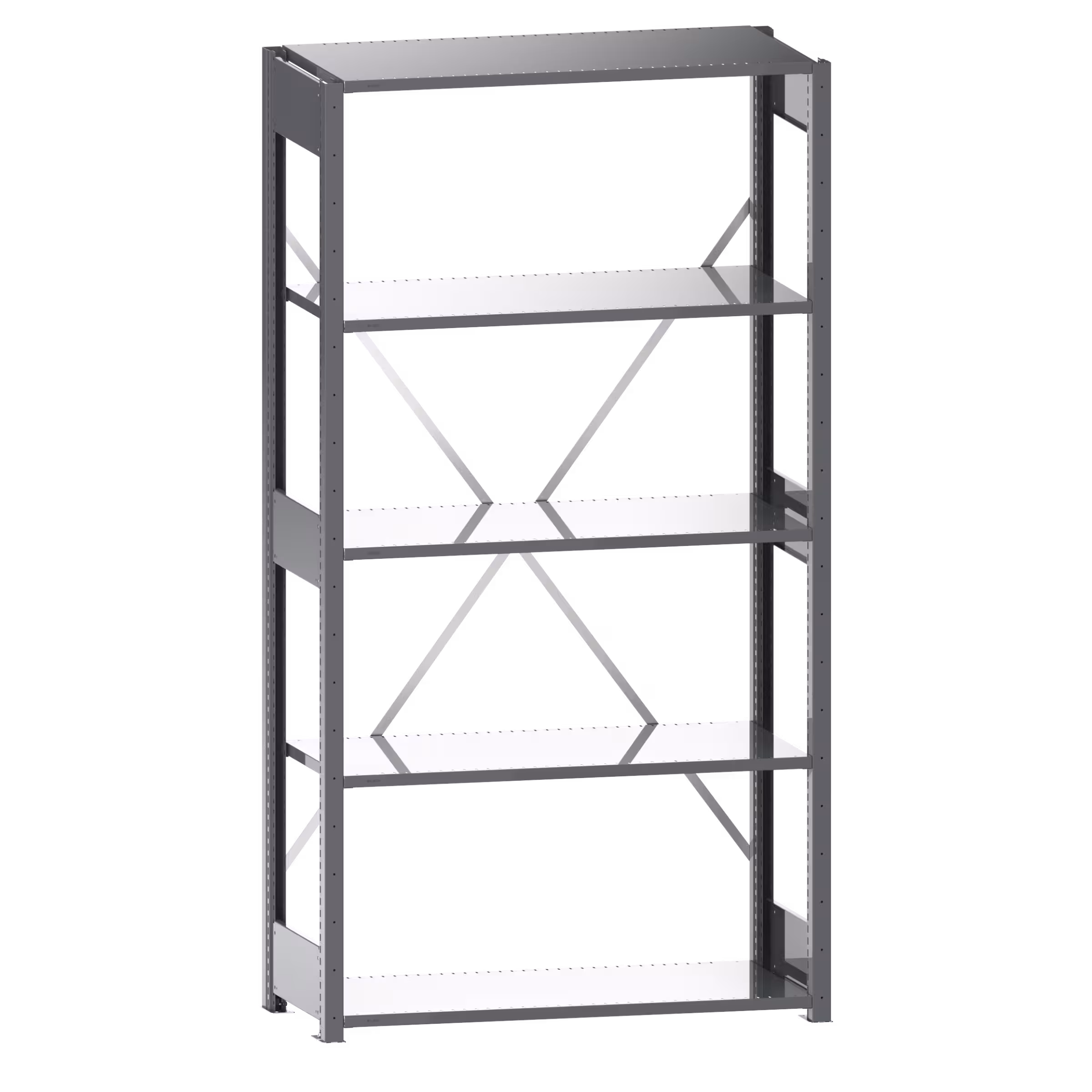 2 Regalstützenpaare inkl. 6 Tiefenstreben, 1 Diagonalkreuz verzinkt, Fachböden geschlitzt (Stärke 25 mm)