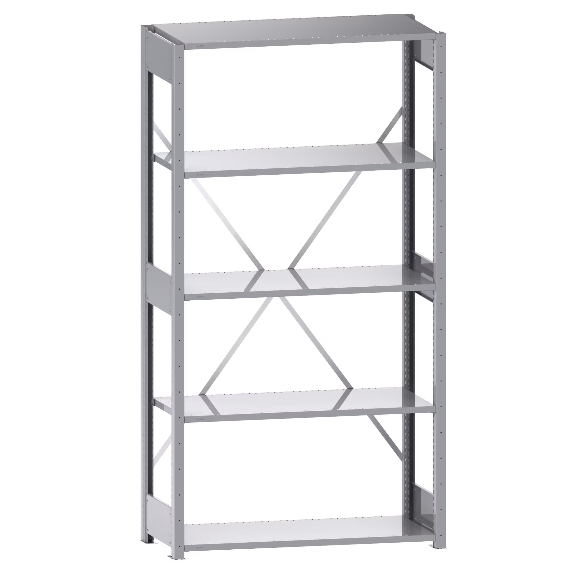 2 Regalstützenpaare inkl. 6 Tiefenstreben, 1 Diagonalkreuz verzinkt, Fachböden geschlitzt (Stärke 25 mm)