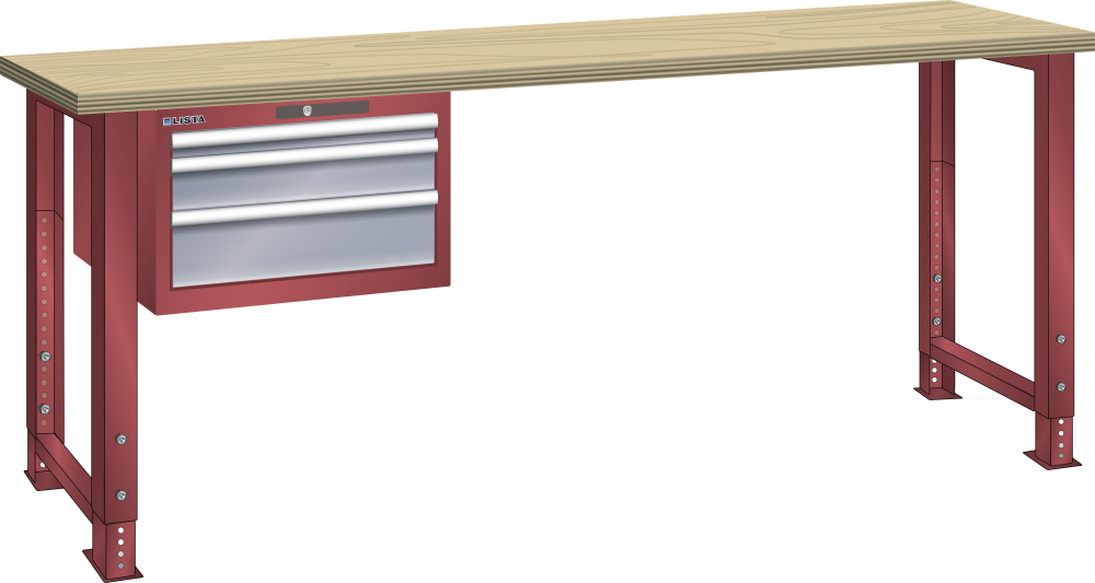 Werkbank 27x36E (BxTxH) 1500x800x750-1100mm 3 Schubladen (1x50/1x100/1x150) 75kg Buche RFID Lock Rubinrot RAL 3003/Grau metallic NCS S 6502-B