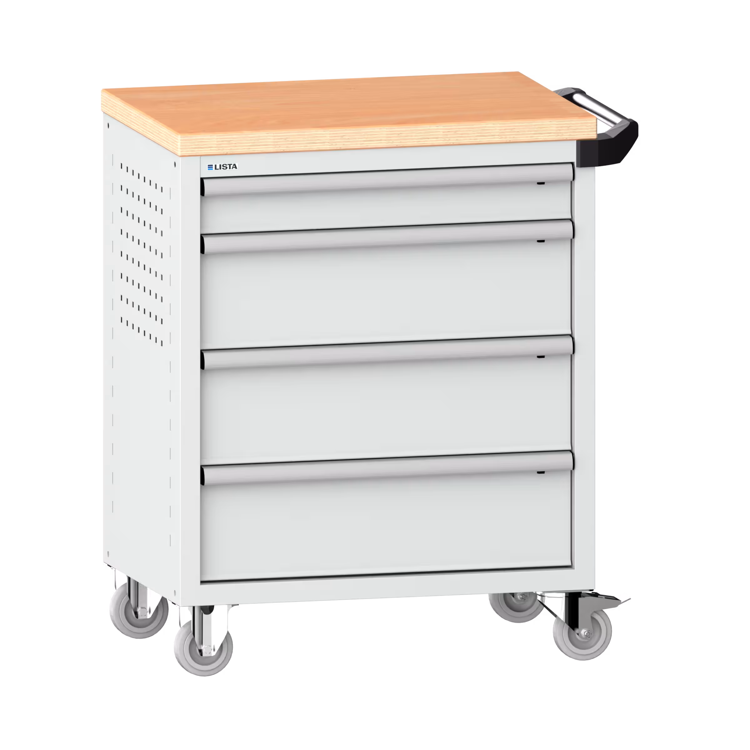 Werkstattwagen 36x27E (BxTxH) 833x525x945mm 4 Schubladen (1x100/3x200) 40kg mit Holzabdeckung Einzelsicherung rechts KEY Lock Lichtgrau RAL 7035