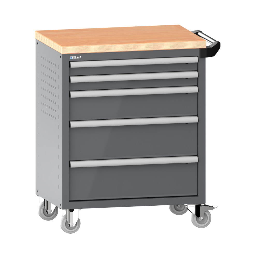 Werkstattwagen 36x27E (BxTxH) 833x525x945mm 5 Schubladen (2x75/1x150/2x200) 40kg mit Holzabdeckung Einzelsicherung rechts KEY Lock Grau metallic NCS S 6502-B