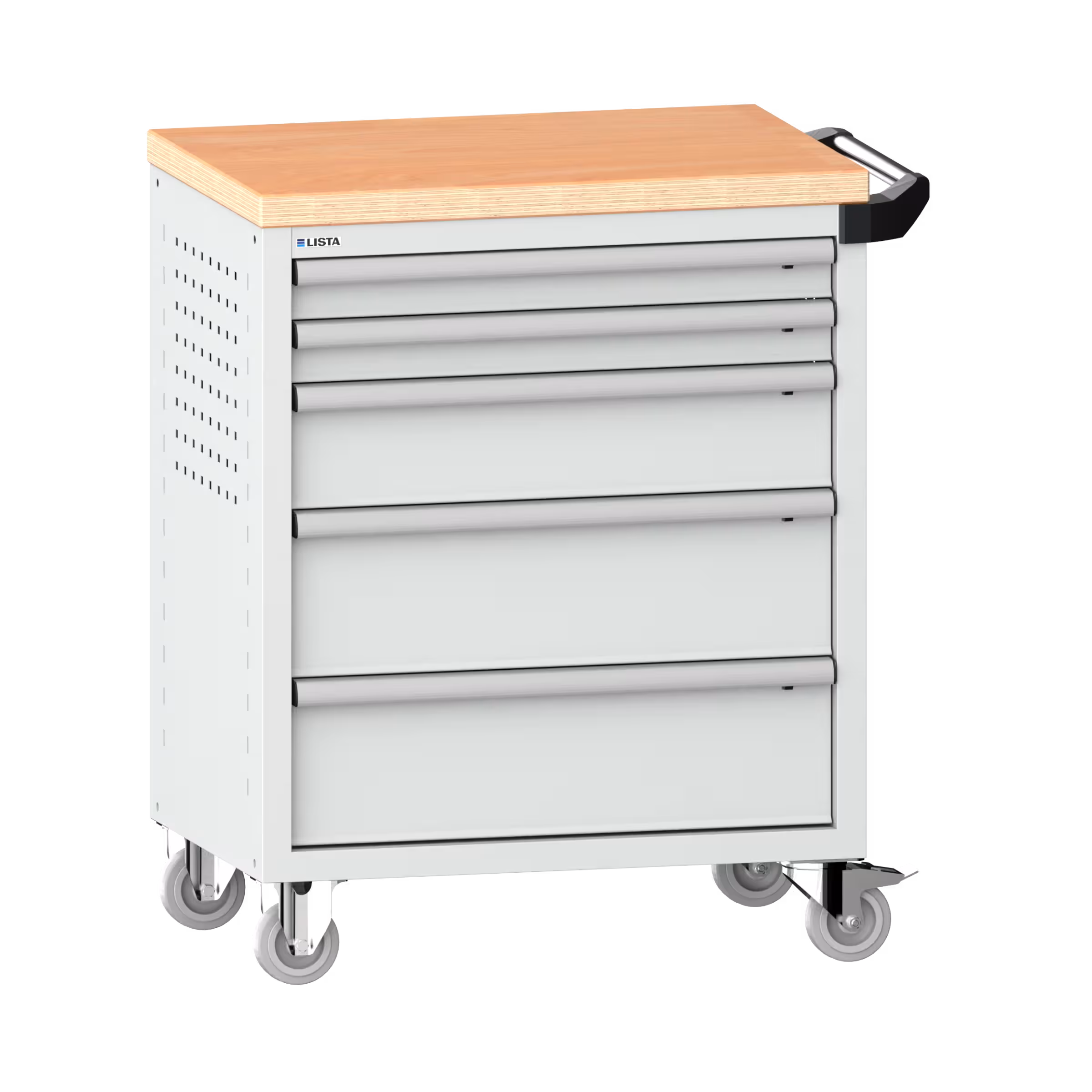 Werkstattwagen 36x27E (BxTxH) 833x525x945mm 5 Schubladen (2x75/1x150/2x200) 40kg mit Holzabdeckung Einzelsicherung rechts KEY Lock Lichtgrau RAL 7035