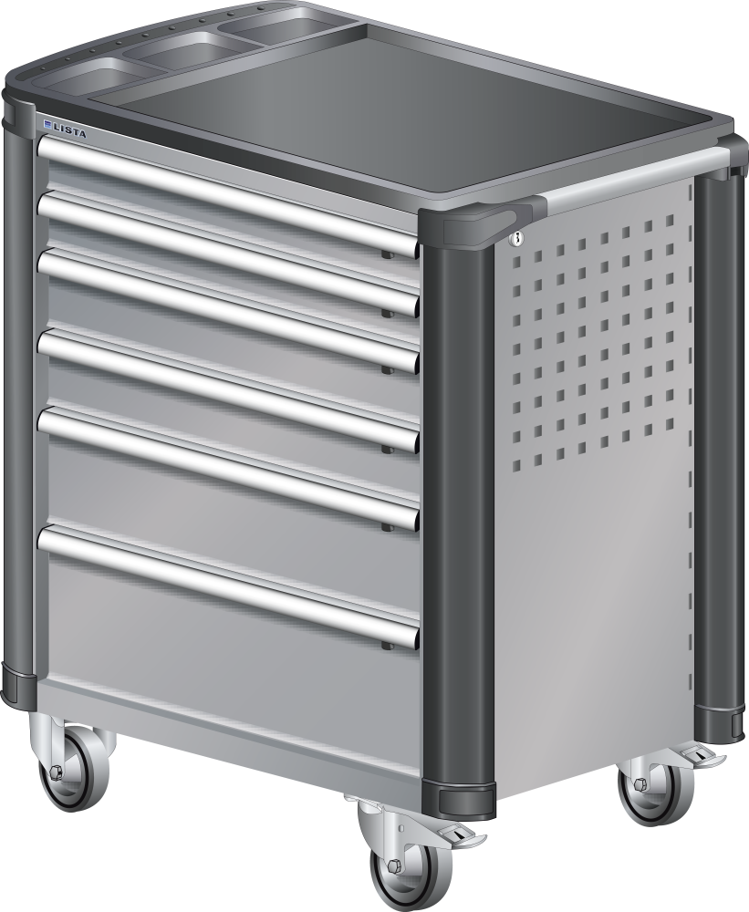 Werkstattwagen 36x27E (BxTxH) 894x525x928mm 6 Schubladen (2x75/2x100/1x150/1x200) 40kg mit Kunststoffabdeckung und Kantenschutz Einzelsicherung rechts KEY Lock Taubengrau NCS S 4502-B