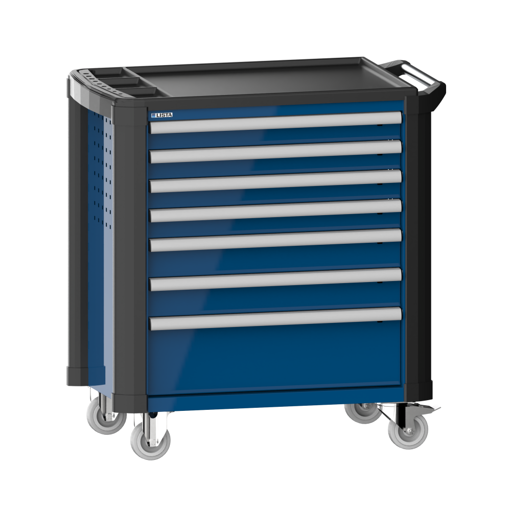 Werkstattwagen 36x27E (BxTxH) 894x525x928mm 7 Schubladen (4x75/2x100/1x200) 40kg mit Kunststoffabdeckung und Kantenschutz Einzelsicherung rechts KEY Lock Enzianblau RAL 5010
