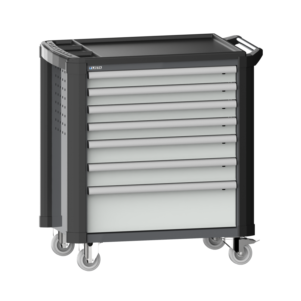 Werkstattwagen 36x27E (BxTxH) 894x525x928mm 7 Schubladen (4x75/2x100/1x200) 40kg mit Kunststoffabdeckung und Kantenschutz Einzelsicherung rechts KEY Lock Grau metallic NCS S 6502-B / Lichtgrau RAL 7035