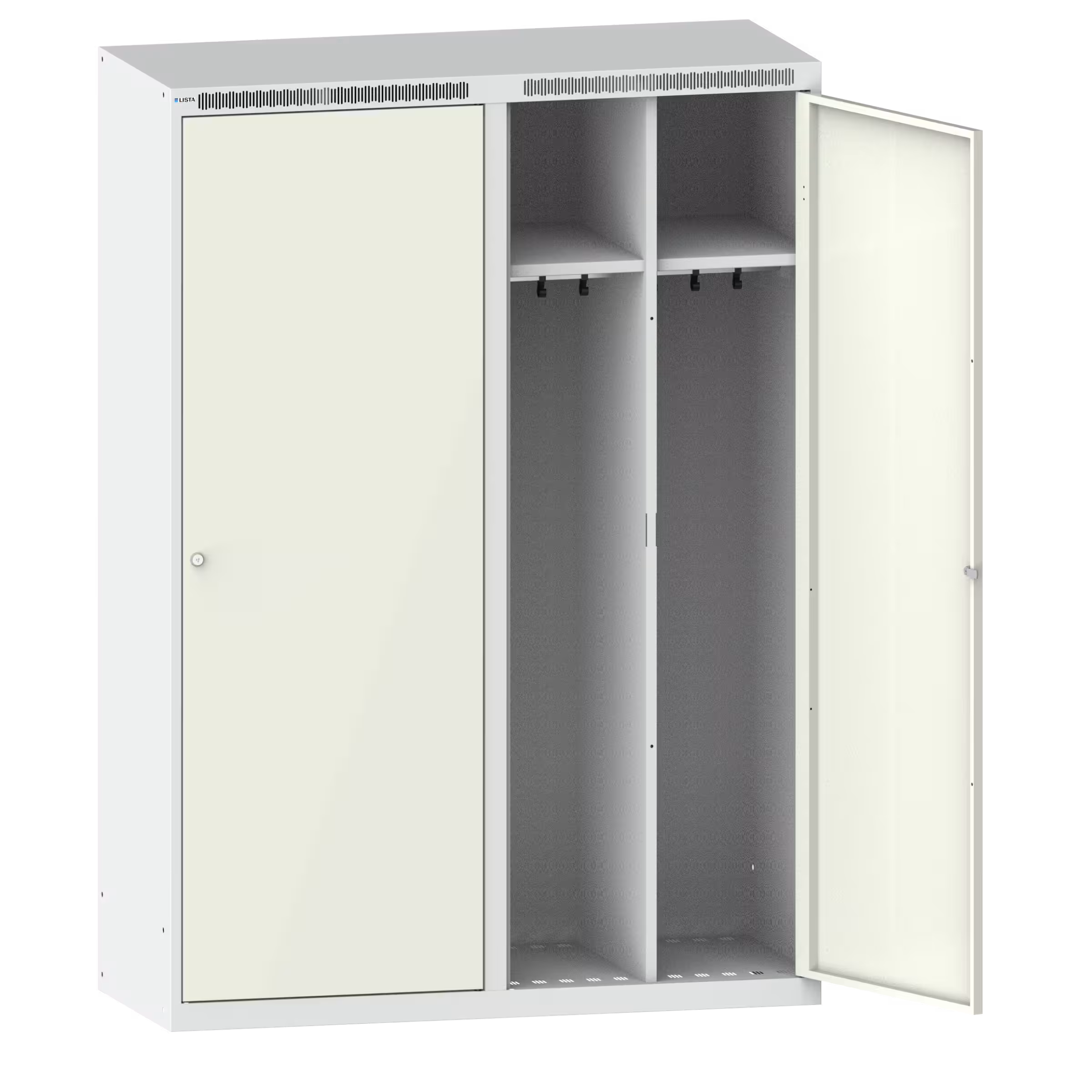 Clothes lockers: Depending on the compartment and model, the clothes lockers are fitted with: single-leaf solid sheet door, flush-fitting, surface plain or with perforated field for additional ventilation (2 compartments lockable / 1 lock for 2 compartments), 1 hat shelf, 1 clothes rack with 3 sliding coat hooks, 1 towel holder