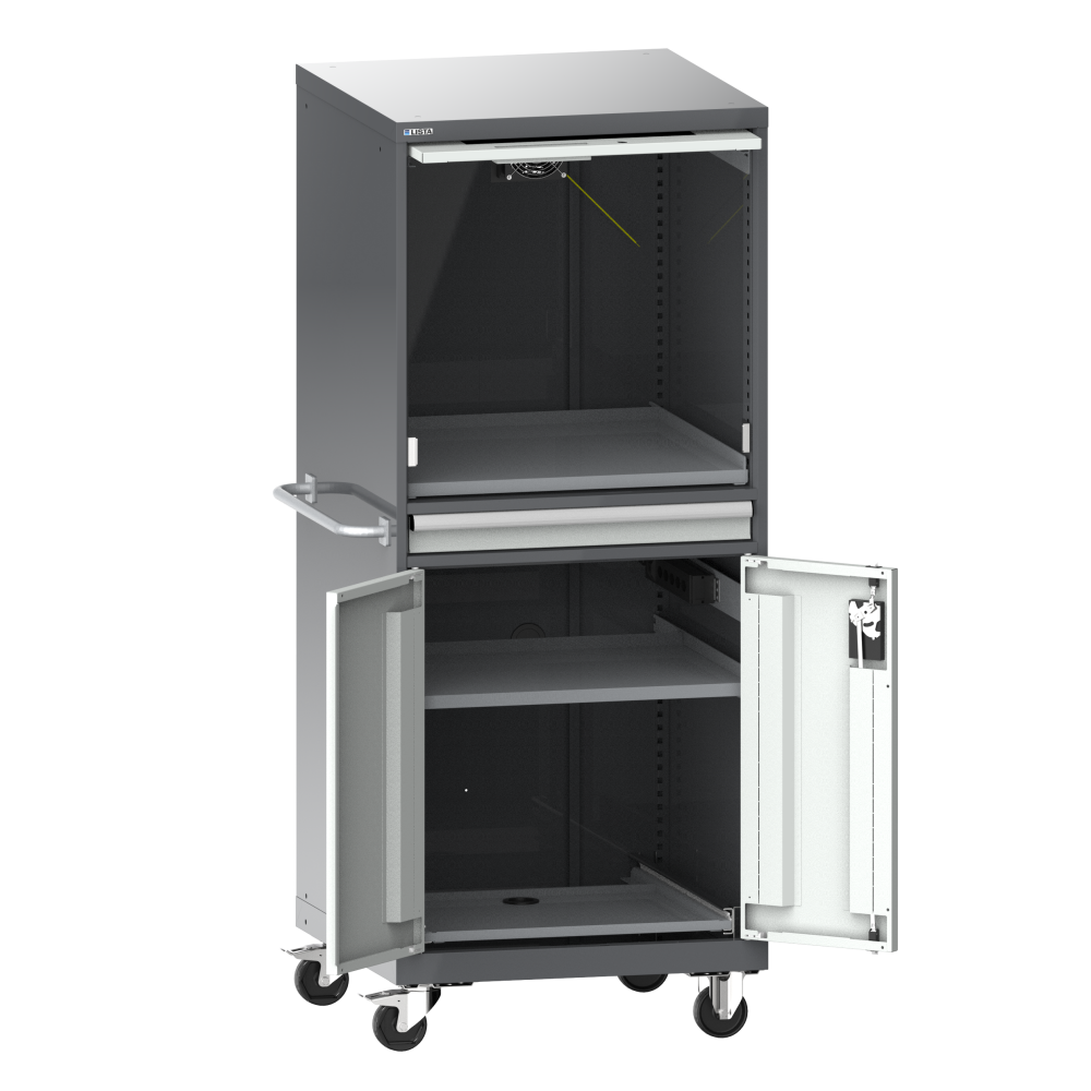 Computer cabinets: Computers and the corresponding hardware and software must be protected from dust, dirt and unauthorised access on the shop floor. The LISTA computer cabinet provides a safe and proven solution that fulfils this requirement.