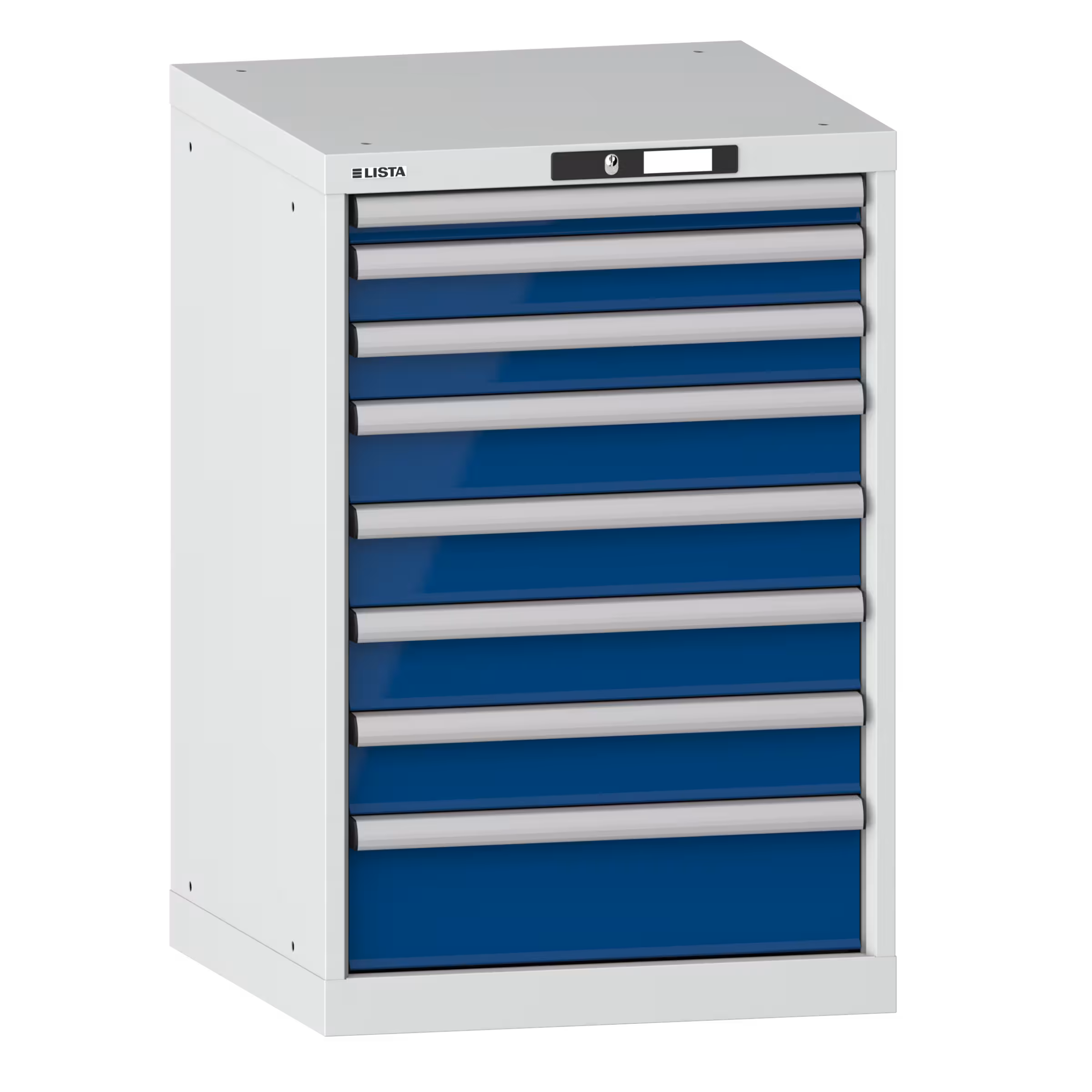 Drawer cabinet 27x27E (WxDxH) 564x572x850mm 8 drawers (1x50/2x75/4x100/1x150) 75kg KEY Lock Light grey RAL 7035 / Signal blue RAL 5005