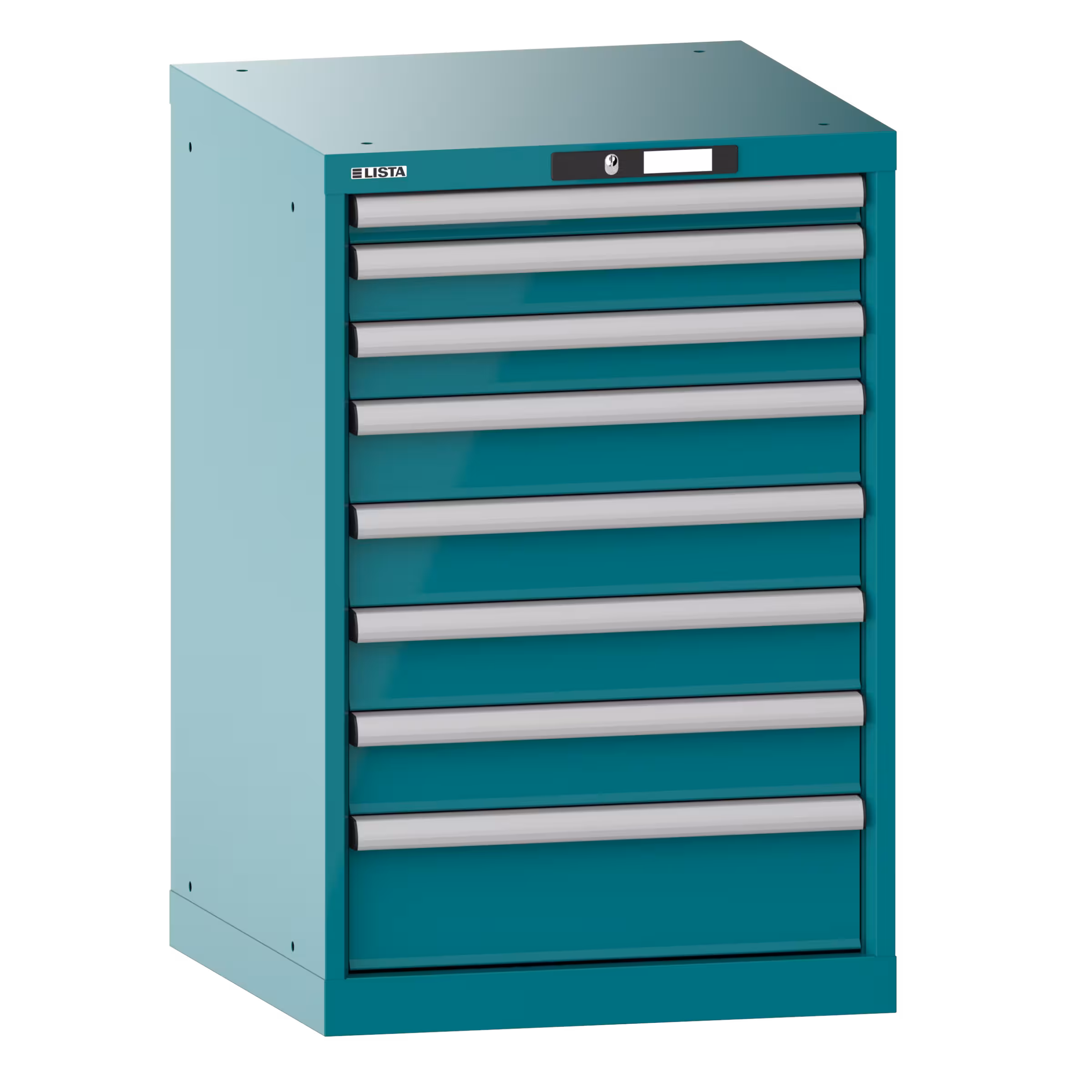 Drawer cabinet 27x27E (WxDxH) 564x572x850mm 8 drawers (1x50/2x75/4x100/1x150) 75kg KEY Lock Turquoise blue RAL 5018