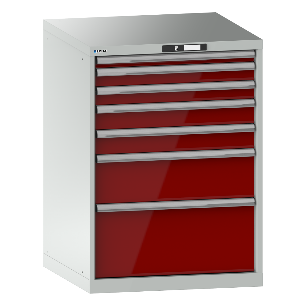 Drawer cabinet 36x36E (WxDxH) 717x725x1000mm 7 drawers (1x50/2x75/2x100/1x200/1x300) 75kg KEY Lock Light grey RAL 7035 / Ruby red RAL 3003