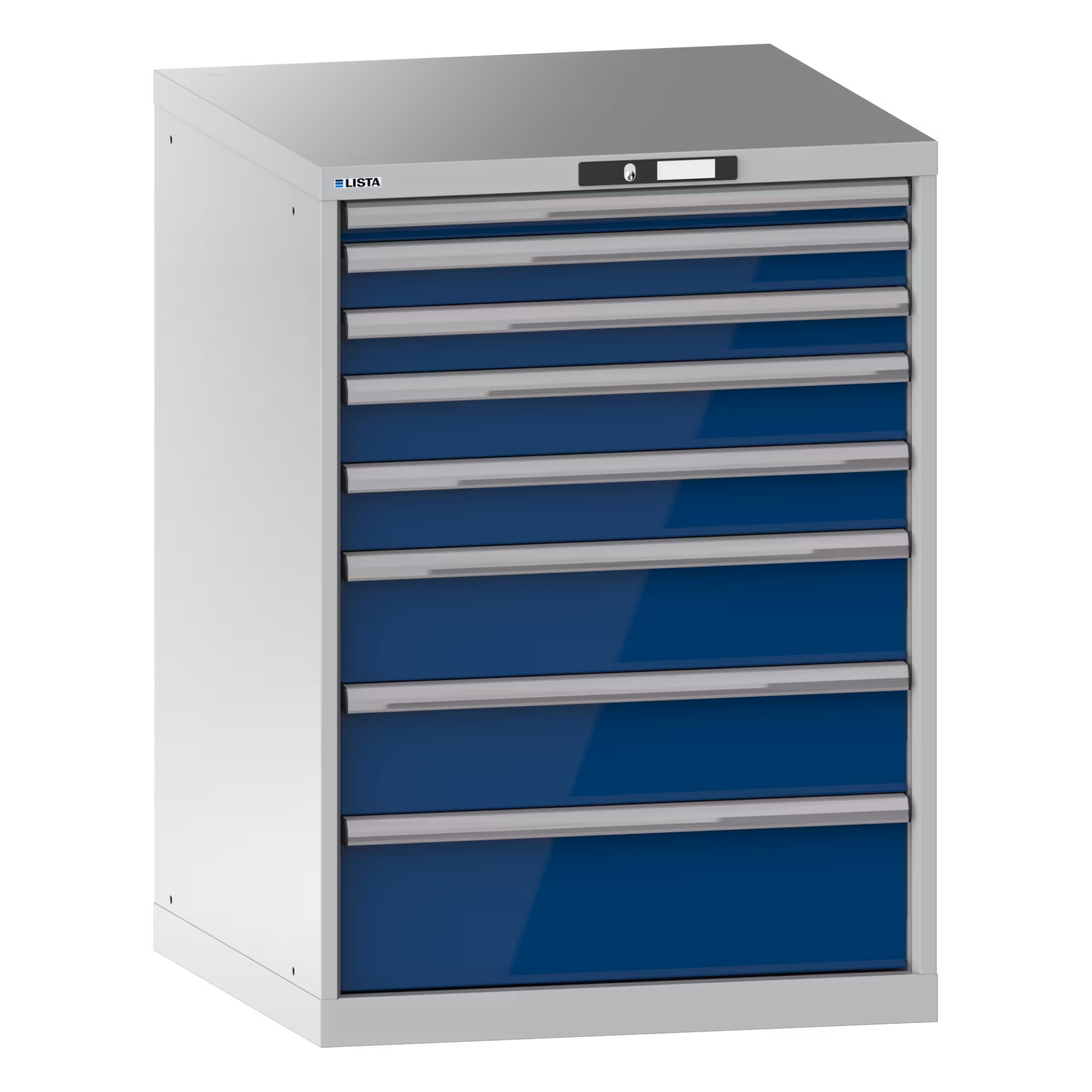 Drawer cabinet 36x36E (WxDxH) 717x725x1000mm 8 drawers (1x50/2x75/2x100/2x150/1x200) 75kg KEY Lock Light grey RAL 7035 / Signal blue RAL 5005