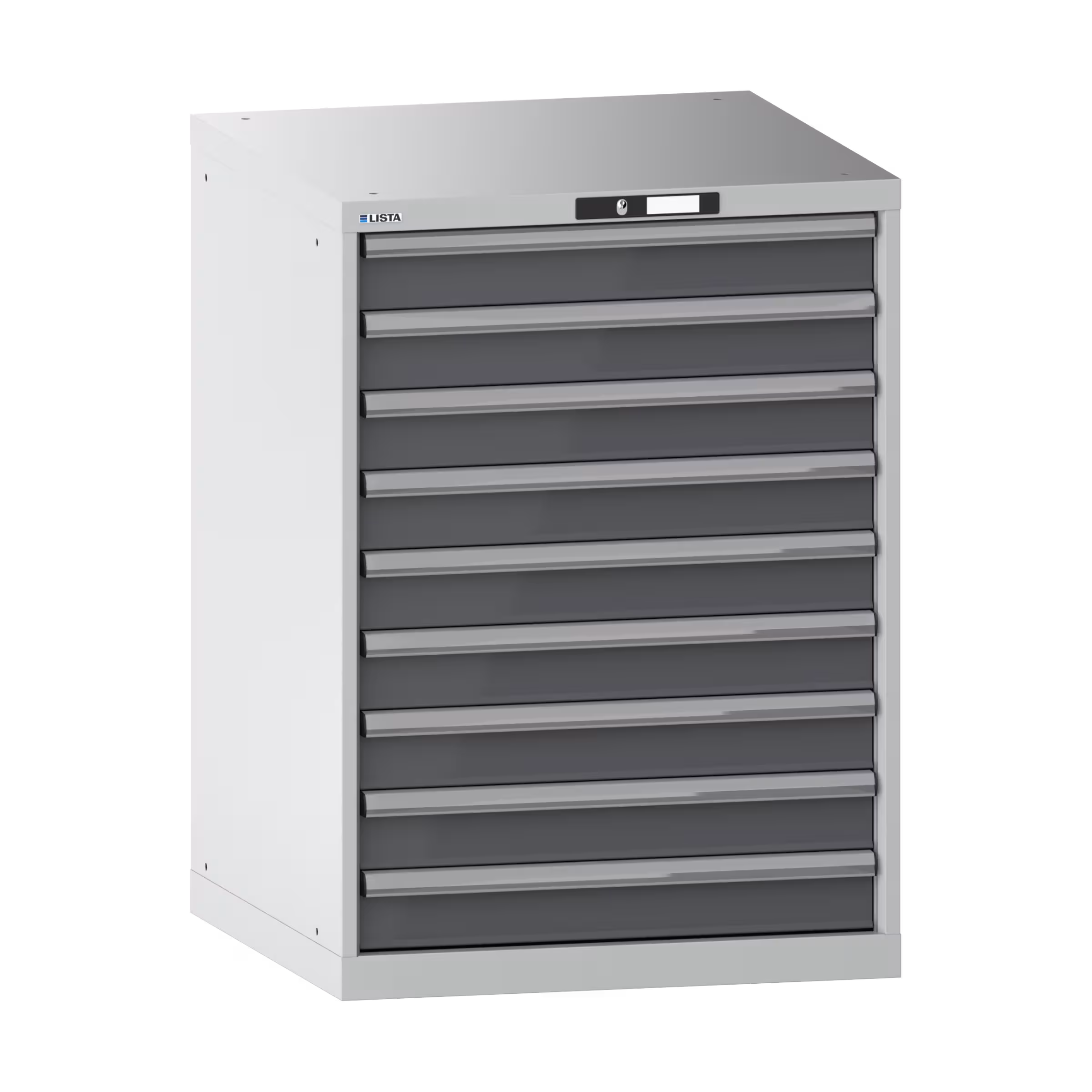 Drawer cabinet 36x36E (WxDxH) 717x725x1000mm 9 drawers (9x100) 75kg KEY Lock Light grey RAL 7035 / Grey metallic NCS S 6502-B