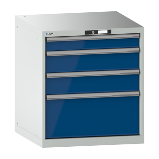 Drawer cabinet 36x36E (WxDxH) 717x725x800mm 4 drawers (1x100/2x150/1x300) 75kg AUTO Lock Light grey RAL 7035 / Signal blue RAL 5005