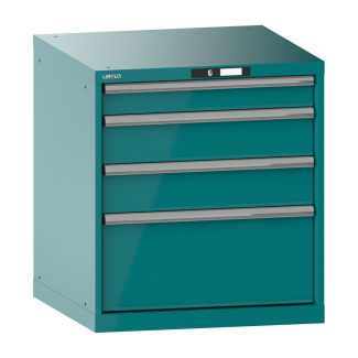 Drawer cabinet 36x36E (WxDxH) 717x725x800mm 4 drawers (1x100/2x150/1x300) 75kg AUTO Lock Turquoise blue RAL 5018