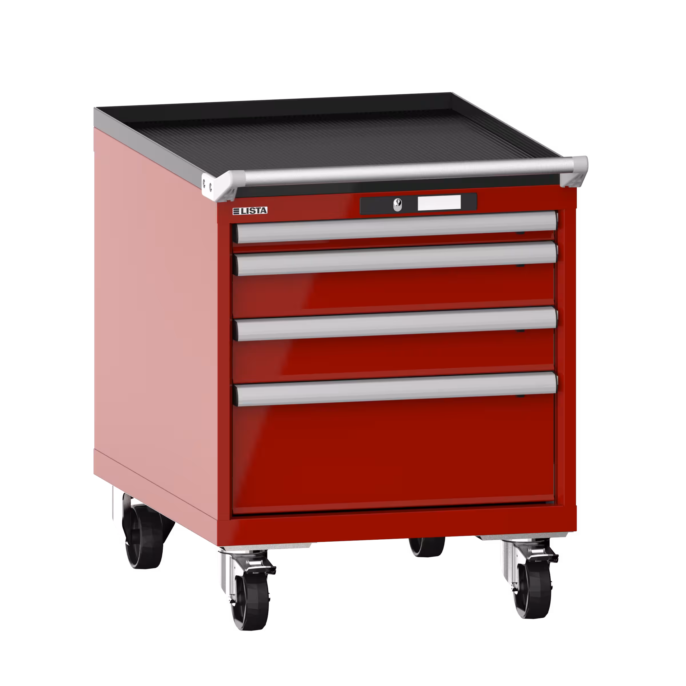 Drawer cabinet mobile 27x36E (WxDxH) 564x725x723mm 4 drawers (1x50/2x100/1x200) 75kg nylon castors Ø100mm KEY Lock Ruby red RAL 3003