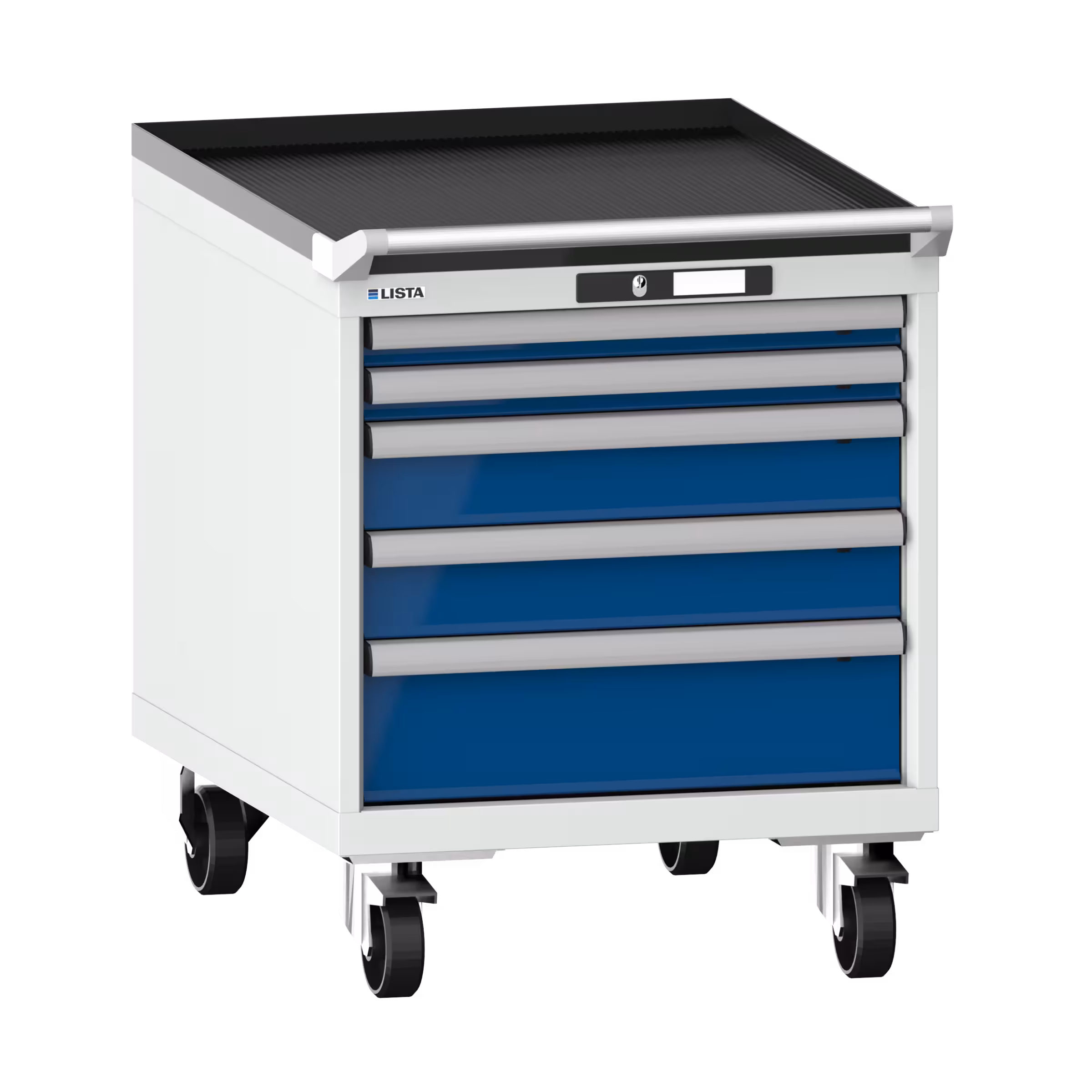 Drawer cabinet mobile 27x36E (WxDxH) 564x725x723mm 5 drawers (2x50/2x100/1x150) 75kg nylon castors Ø100mm KEY Lock Light grey RAL 7035 / Signal blue RAL 5005