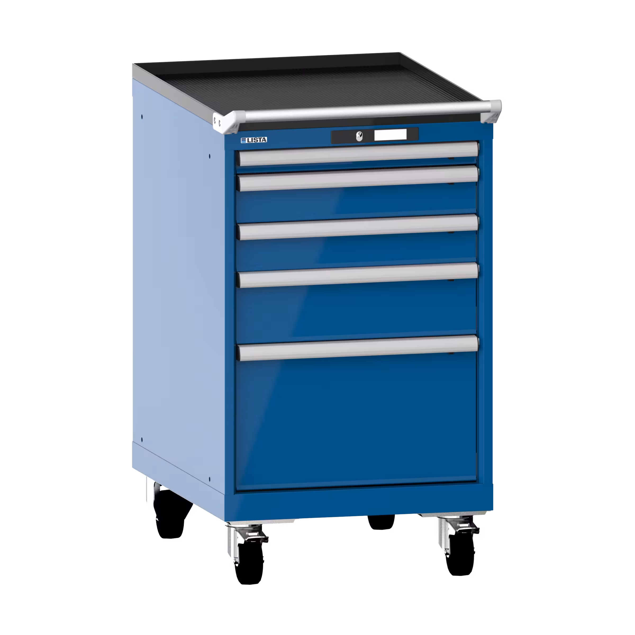 Drawer cabinet mobile 27x36E (WxDxH) 564x725x990mm 5 drawers (1x50/2x100/1x150/1x300) 75kg nylon castors Ø100mm KEY Lock Capri blue RAL 5019
