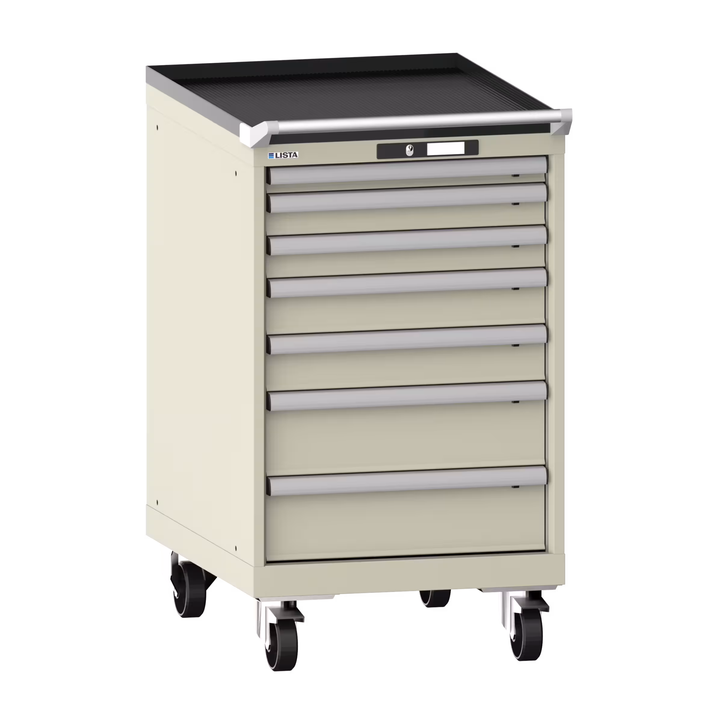 Drawer cabinet mobile 27x36E (WxDxH) 564x725x990mm 7 drawers (1x50/2x75/2x100/2x150) 75kg nylon castors Ø100mm RFID Lock Pebble grey RAL 7032