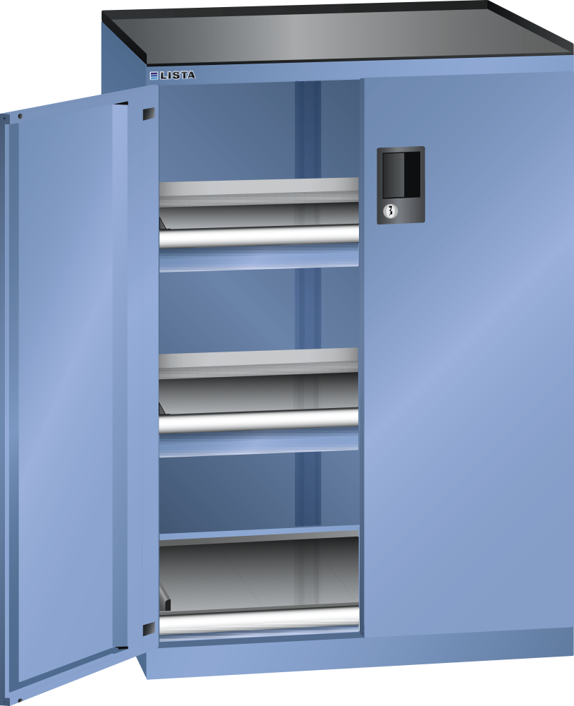 Drawer cabinet with hinged doors 36x27E (WxDxH) 717x600x1020mm 2 drawers (75kg), 1 pull-out shelf (75kg) KEY Lock Capri blue RAL 5019